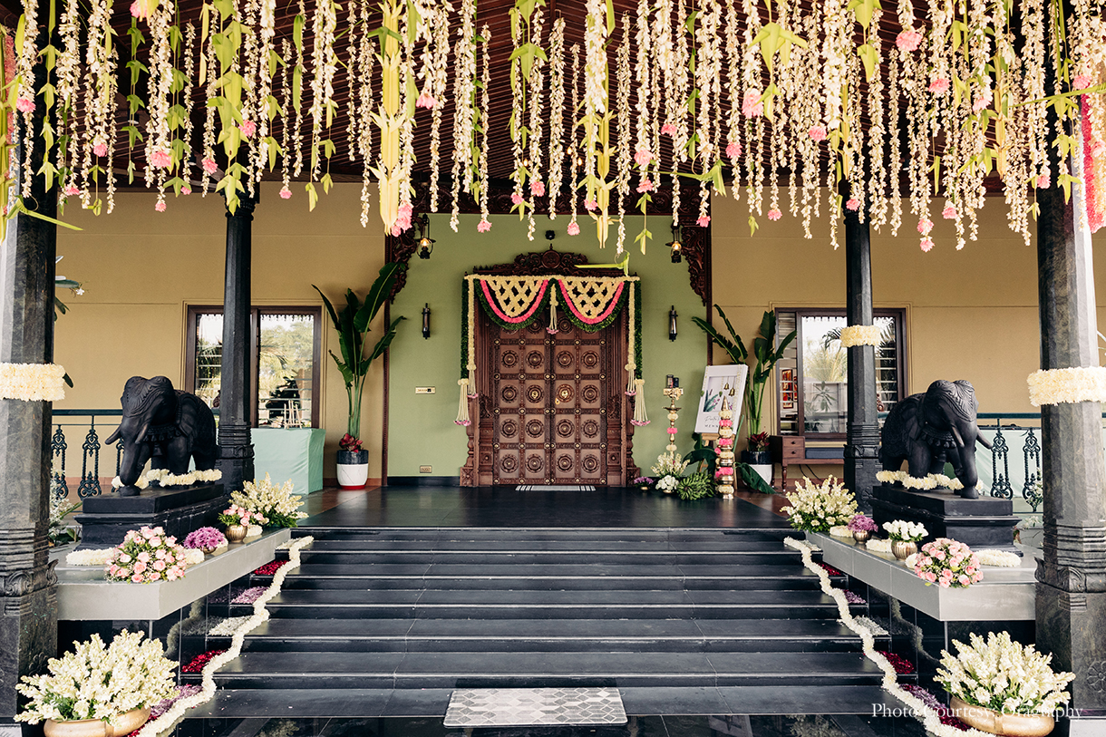 Hosted at the newly built family home, this event was a vibrant homage to South Indian aesthetics. Traditional décor elements, like banana leaves, coconuts, and fresh jasmine garlands, mingled with thoughtful guest experiences like gajra welcome trays, tarot readings, and block printing on tote bags. “The space echoed my father’s architectural vision,” says Pavitra, “and we wanted every detail to honor that.” Guests also enjoyed authentic South Indian fare, while a garden corner hosted rounds of poker and blackjack for the men.