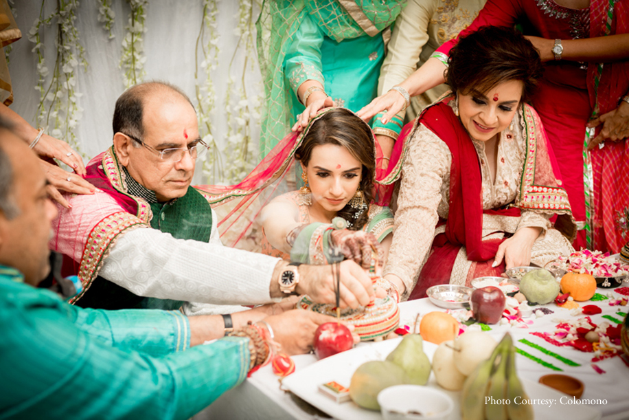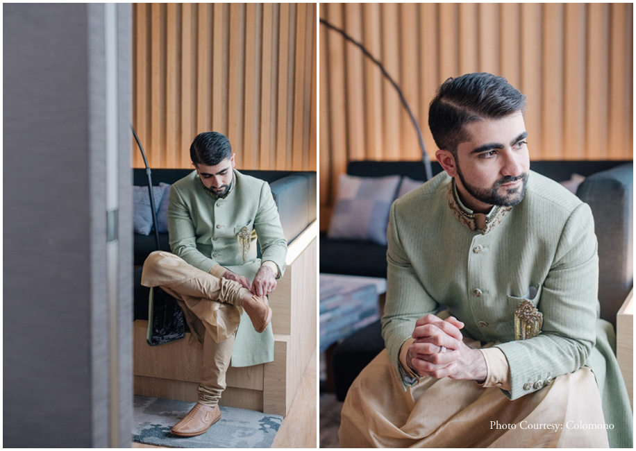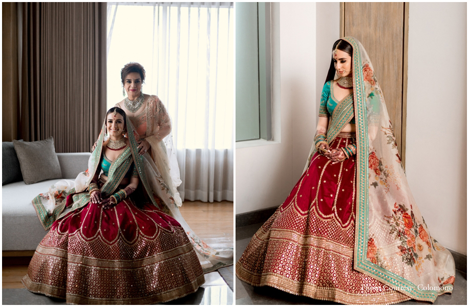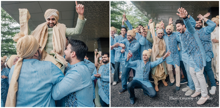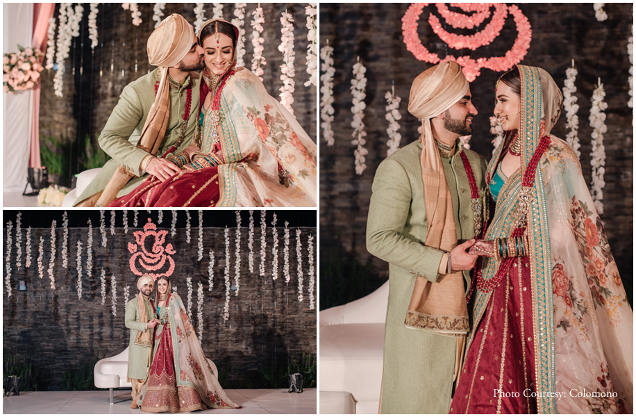The bride wore a traditional red lehenga by Sabyasachi Mukherjee, with a blue blouse and chunari lending a modern twist. The groom opted for a sage-green sherwani by Shantanu and Nikhil with a beige saafa. His groomsmen wore similar blue kurtas.