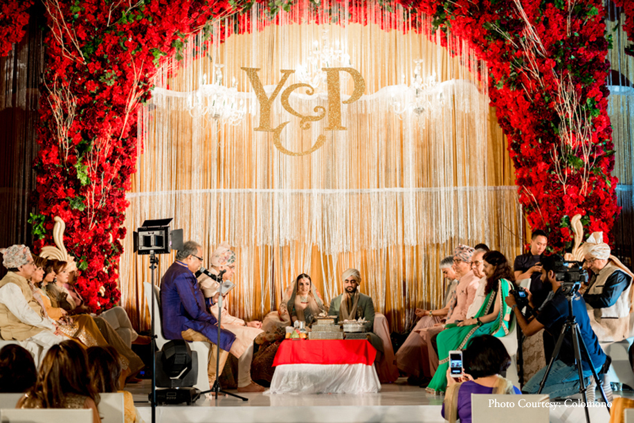 The mandap was decorated with foliage, striking red flowers and green and white danglers. Payal made her entry under a phoolon ki chadar held high by her brothers. The one-of-a-kind chadar was made of exotic flowers in shades of pink and yellow, with a bunting made of white flowers.