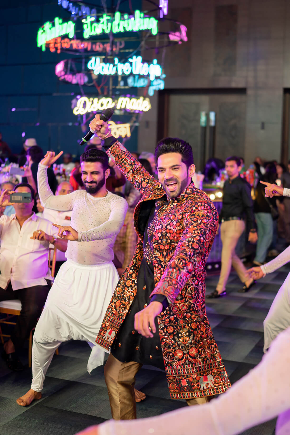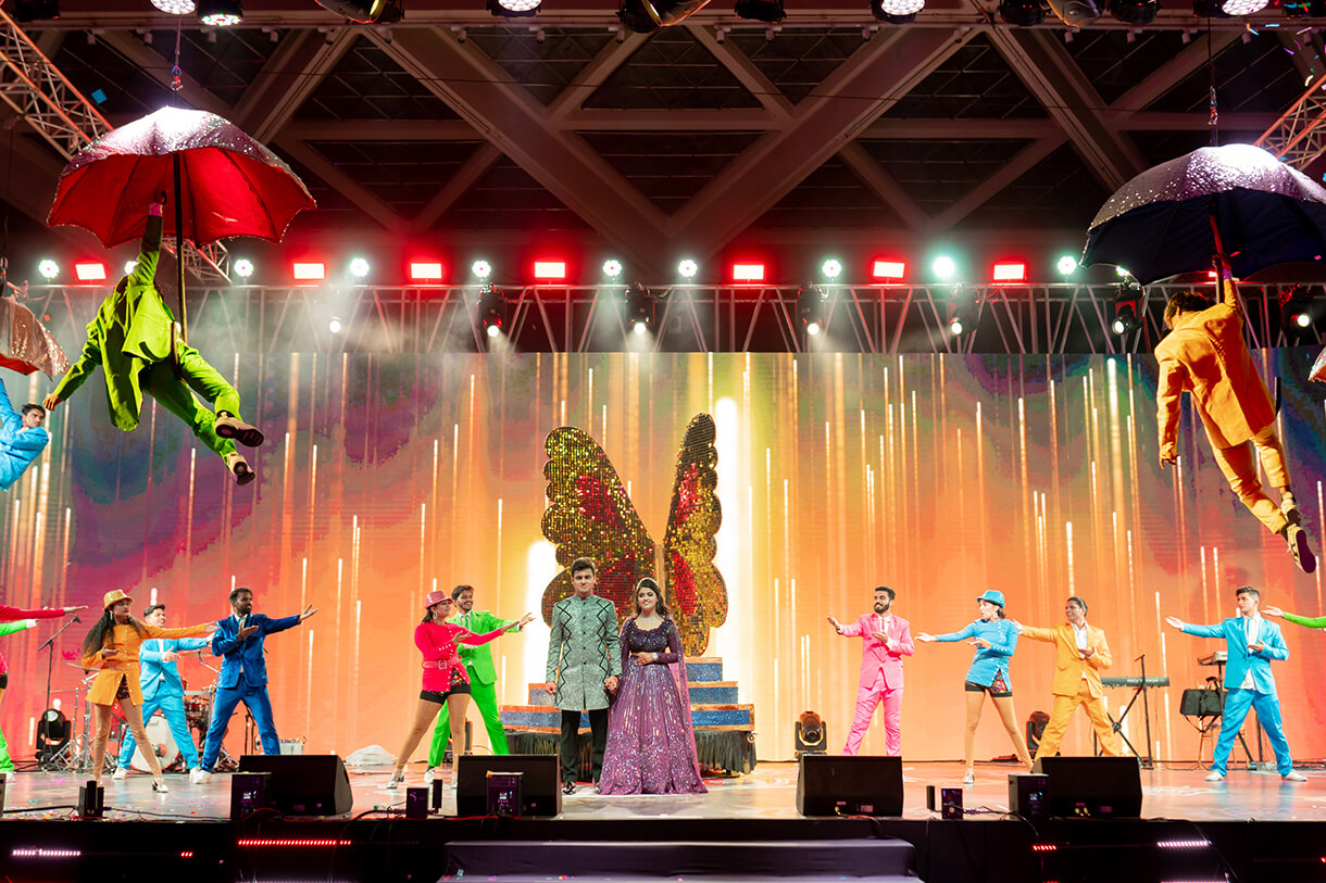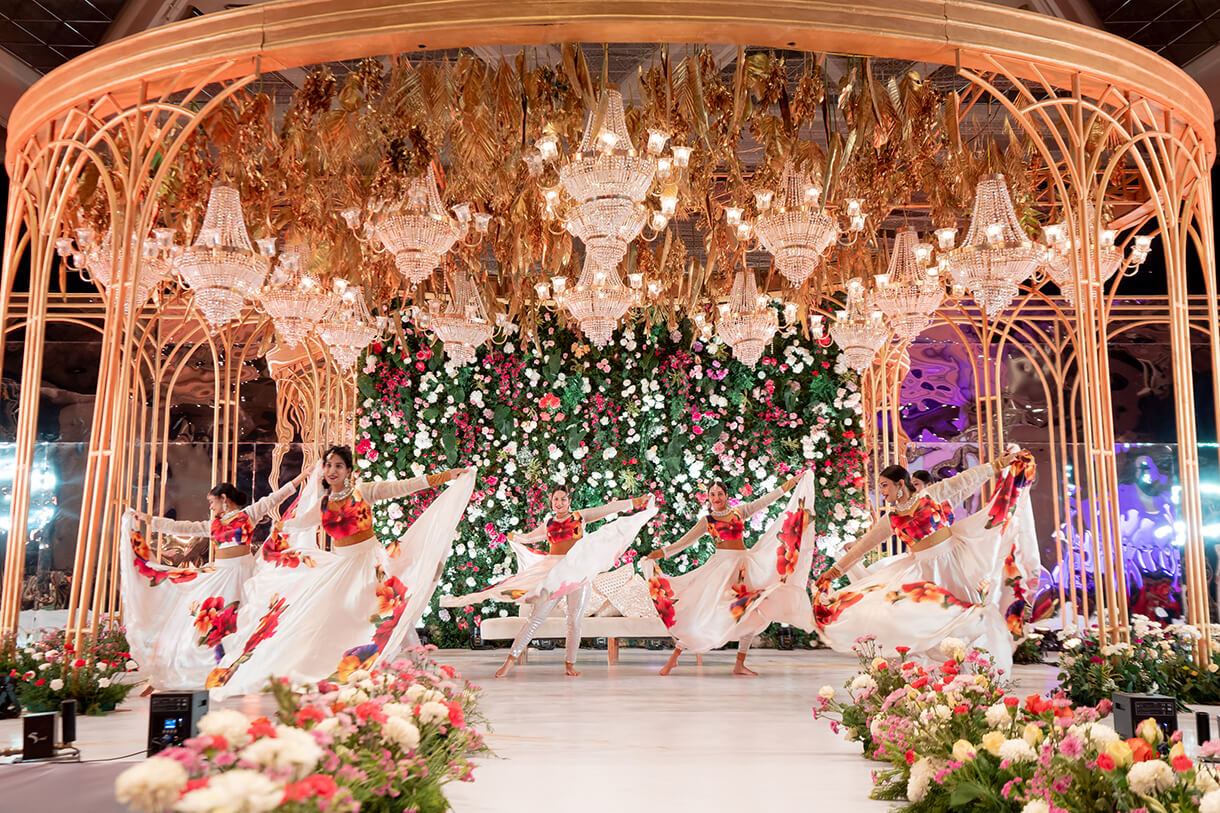 Reetu shares, “The sangeet was an enchanting celebration inspired by Gucci, designed to offer guests a larger-than-life experience. The décor, adorned with bold prints and vibrant colours, perfectly captured the essence of Gucci luxury. Each element, from the entry to the photo booth and pathway, reflected the brand’s signature style. The grand entry, with over 40 dancers and suspended performers, set the stage for a breathtaking atmosphere. Personalized choreography and unique props added creativity to the performances, leaving guests in awe.”