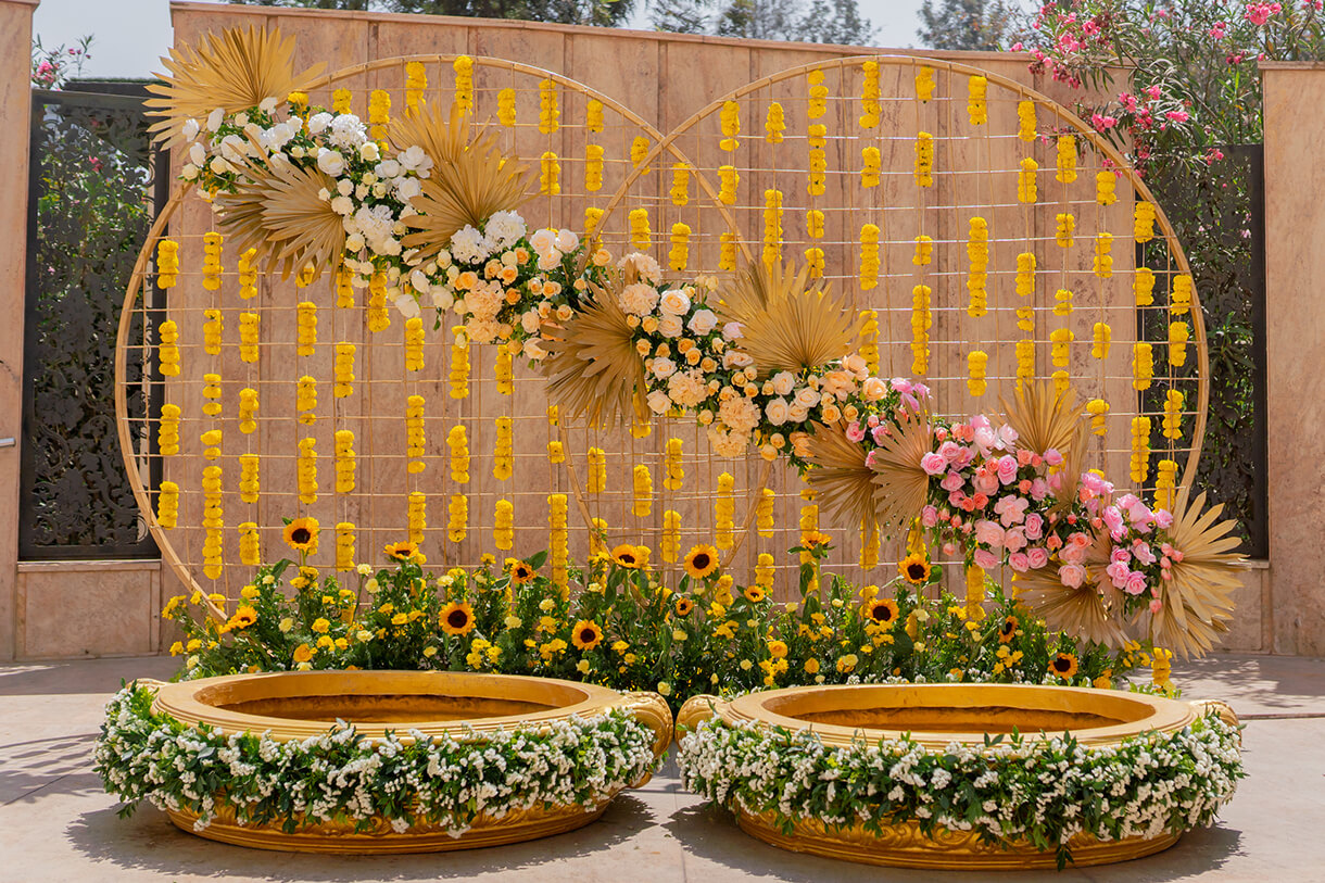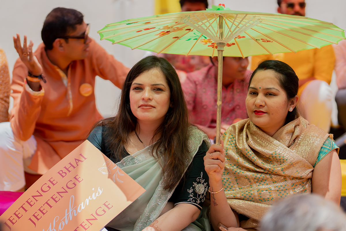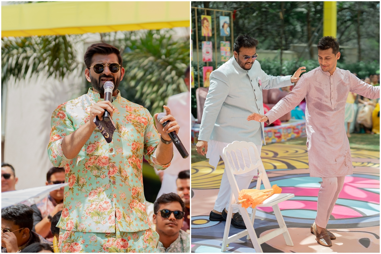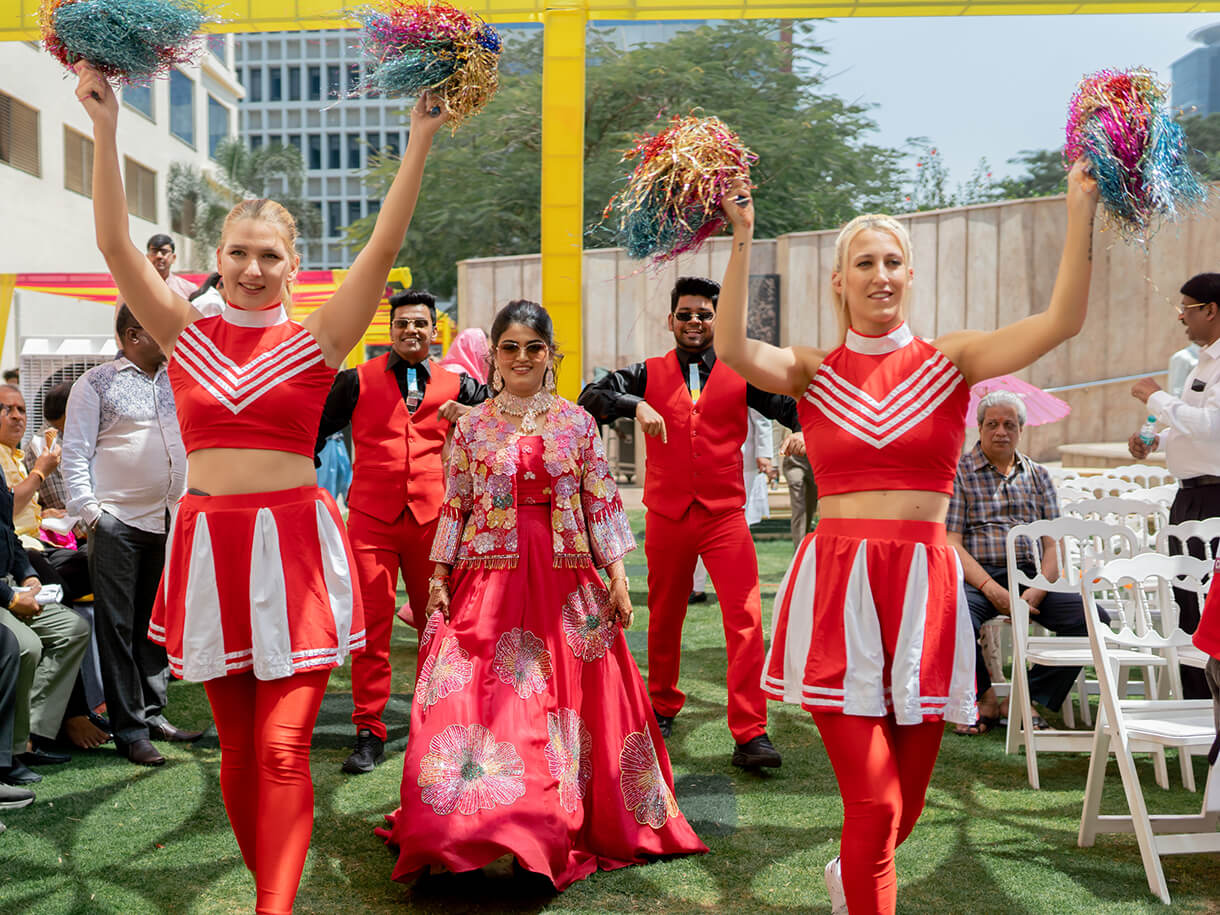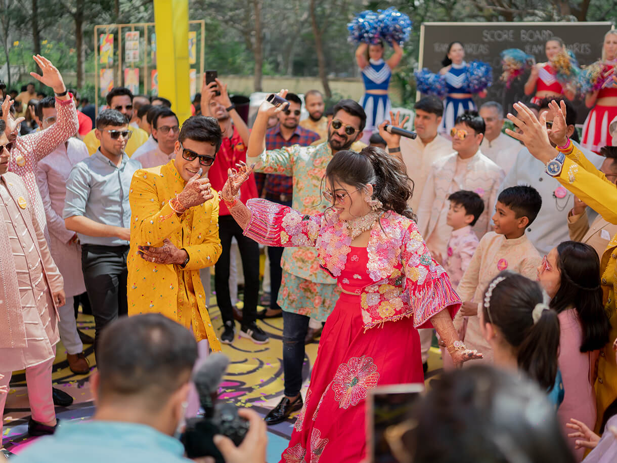 For the haldi, things took the unconventional route as Reetu shares, “The haldi had a unique ‘Haldi Pro League’ theme. We aimed to break away from the traditional, subdued atmosphere of a haldi ceremony and create an event that was filled with fun, energy, and laughter. We wanted to create a haldi event that was like no other, thus, the concept of ‘Haldi Pro League’ was born! It was full of vibrant pop art décor and sporty elements like cheerleaders and badges. The couple’s grand entrance, accompanied by a cheerleading squad and an energetic dance performance, set the mood. Each family was given their own colourful badges and entry bands, adding a touch of team spirit to the event. Guests enthusiastically participated in the interactive games, and the live scoreboard added an element of real-time competitiveness. To beat the summer heat, gelatos were served and after the high-energy activities, guests enjoyed a relaxing post-Haldi foot spa, providing a perfect way to unwind.”