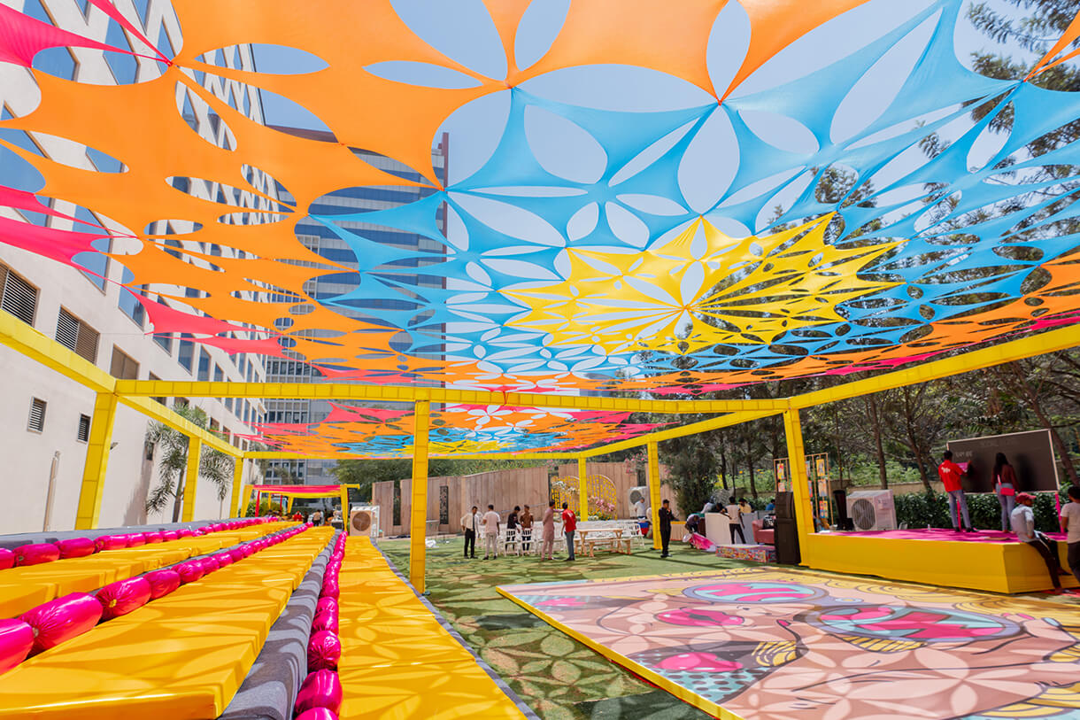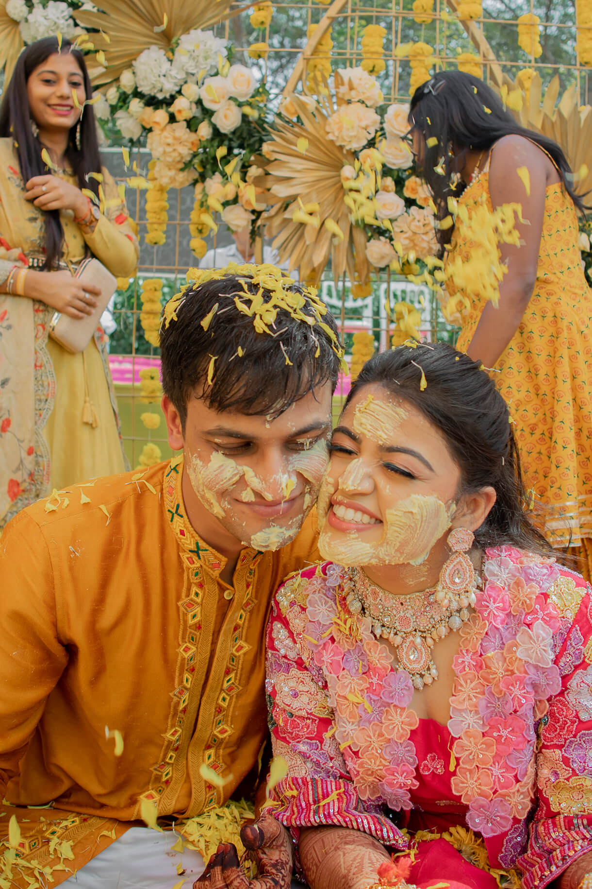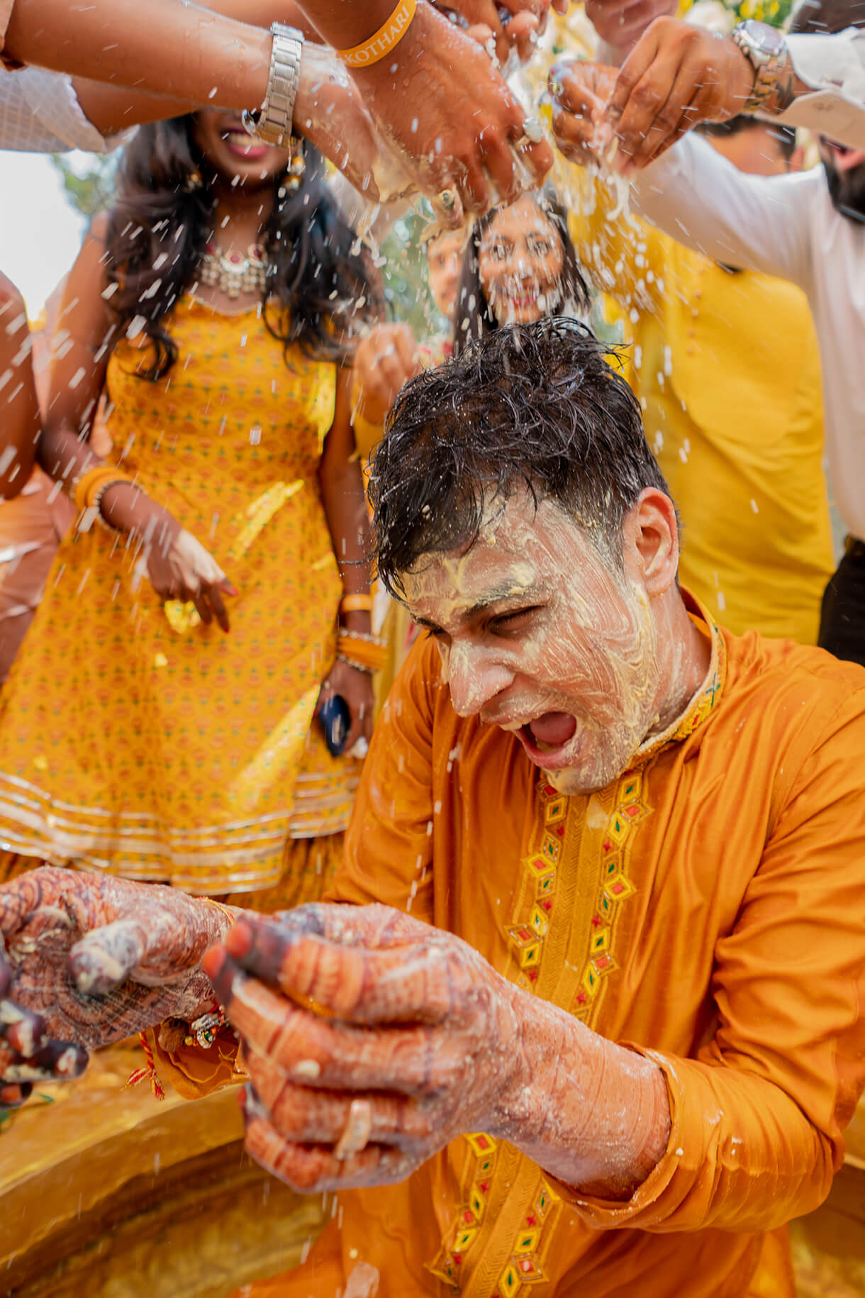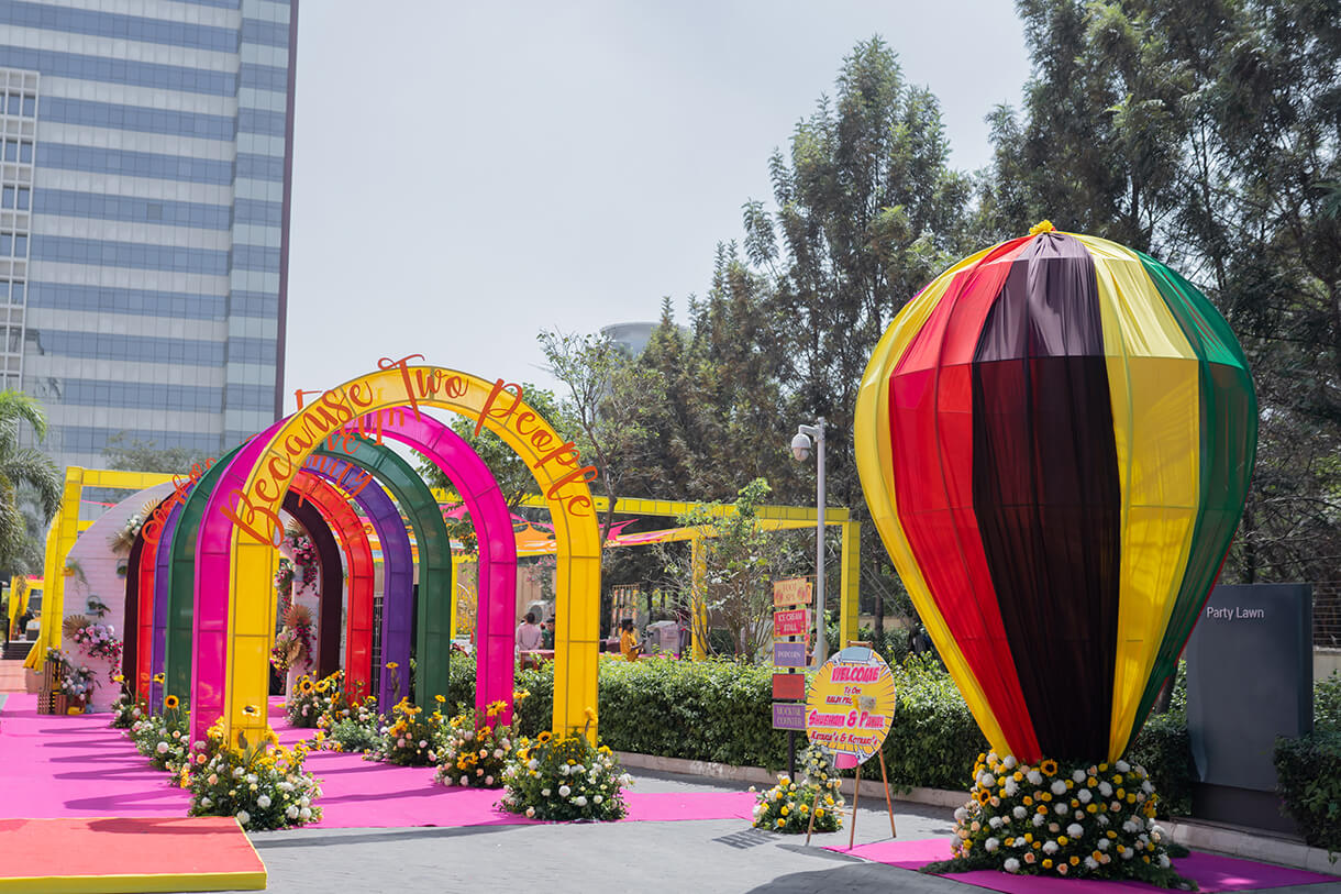 For the haldi, things took the unconventional route as Reetu shares, “The haldi had a unique ‘Haldi Pro League’ theme. We aimed to break away from the traditional, subdued atmosphere of a haldi ceremony and create an event that was filled with fun, energy, and laughter. We wanted to create a haldi event that was like no other, thus, the concept of ‘Haldi Pro League’ was born! It was full of vibrant pop art décor and sporty elements like cheerleaders and badges. The couple’s grand entrance, accompanied by a cheerleading squad and an energetic dance performance, set the mood. Each family was given their own colourful badges and entry bands, adding a touch of team spirit to the event. Guests enthusiastically participated in the interactive games, and the live scoreboard added an element of real-time competitiveness. To beat the summer heat, gelatos were served and after the high-energy activities, guests enjoyed a relaxing post-Haldi foot spa, providing a perfect way to unwind.”