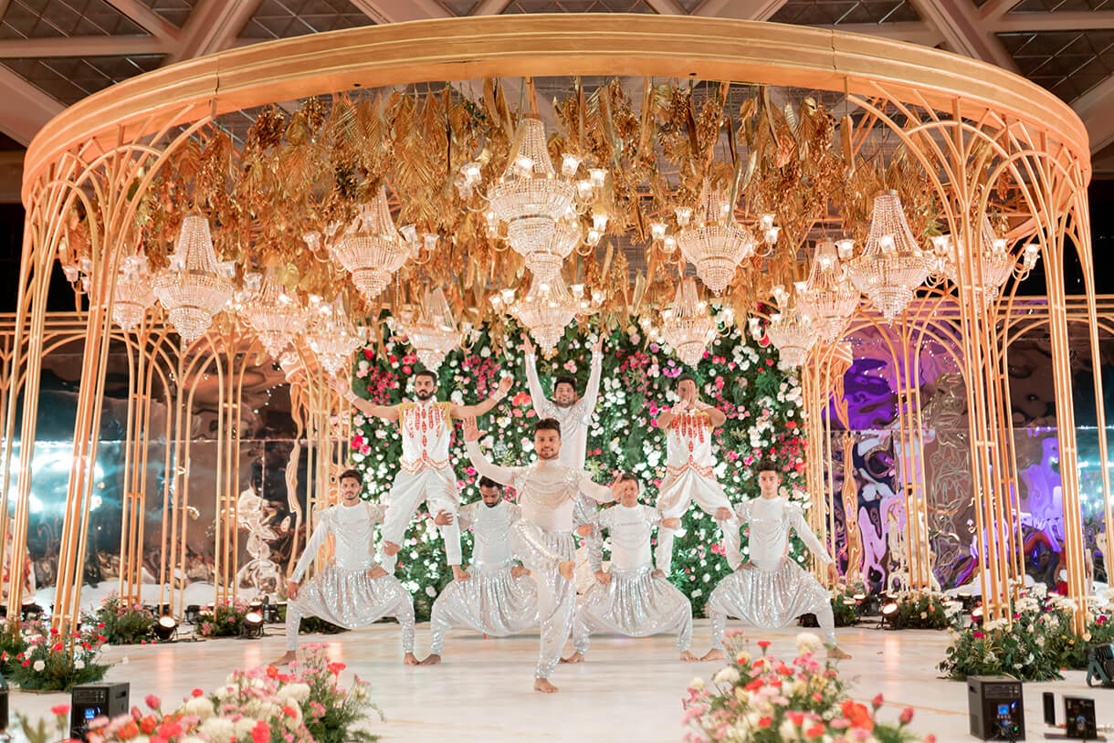 Resembling a dreamy, floral wonderland with beautiful chandeliers, the reception was a stunning celebration. International artists and Akhil Sachdeva’s soulful performance made the evening magical.