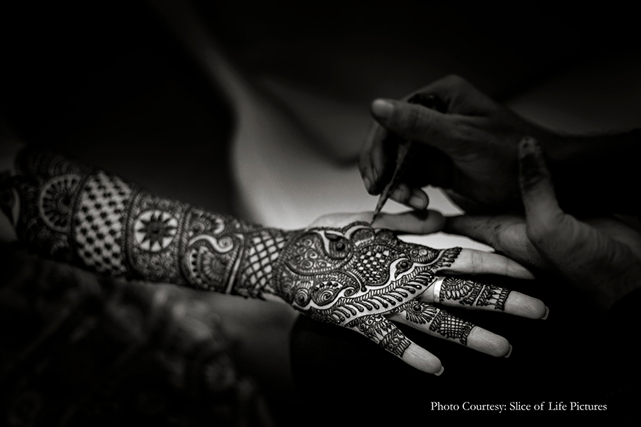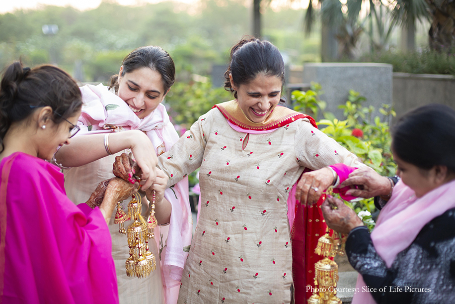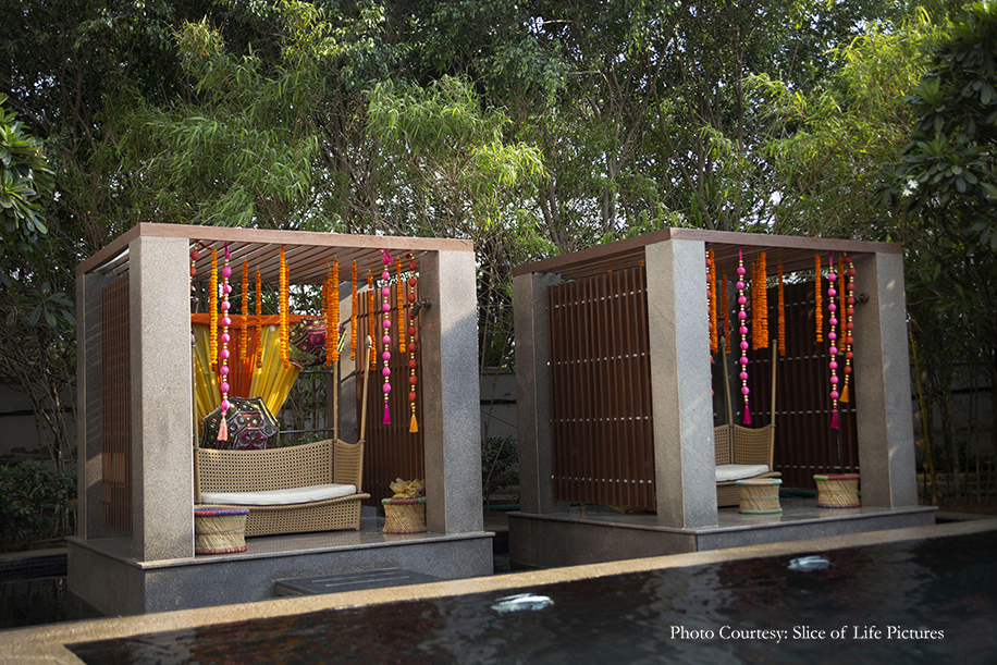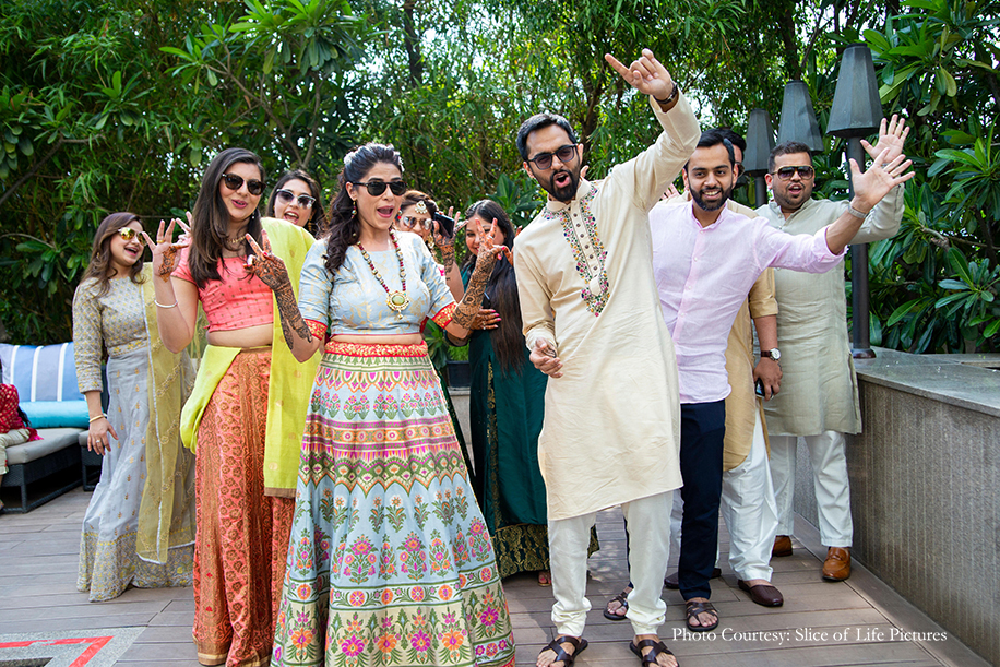 The mehendi had one agenda – to create some fun, memorable moments with the bride’s family. In the outdoors at Le Méridien, Gurgaon, Perminder’s mehendi ceremony was celebrated in traditional style with decor suffused with marigolds, drapes, traditional umbrellas as pops of color in the lush foliage of the venue.