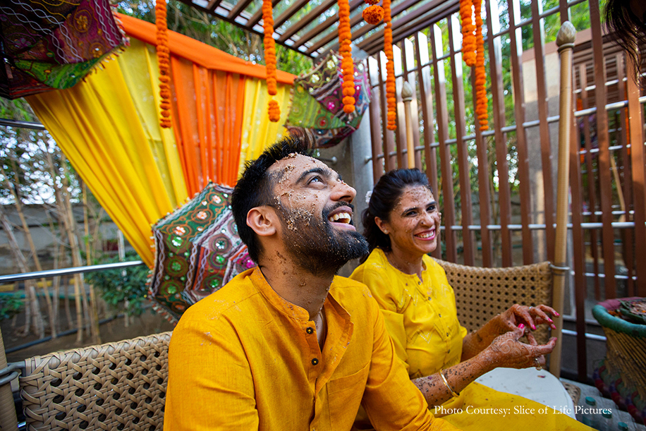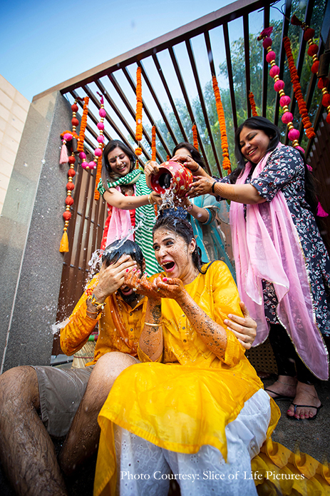 The couple’s haldi ceremony was hosted at the same venue; a boisterous party where the couple were smeared in turmeric before being pushed into the pool by their friends.