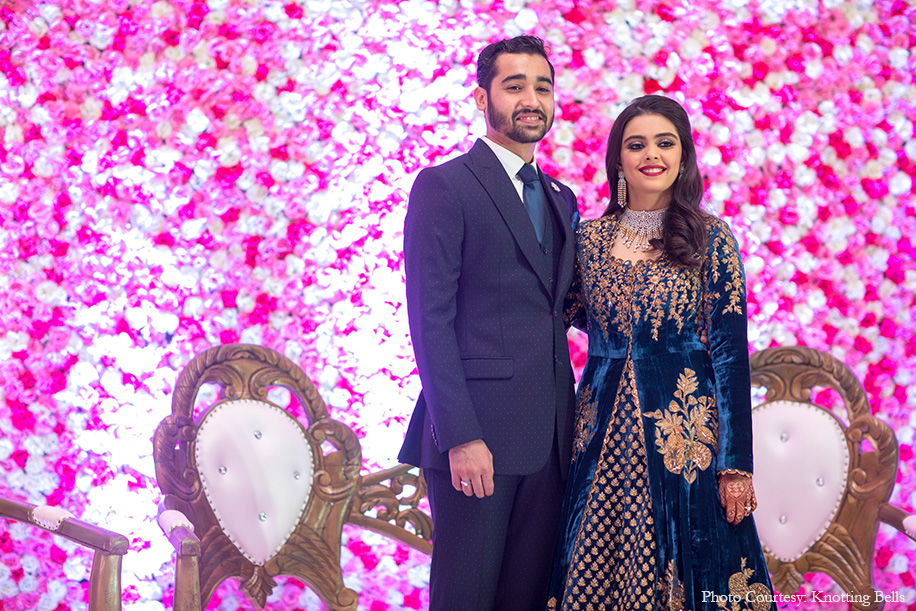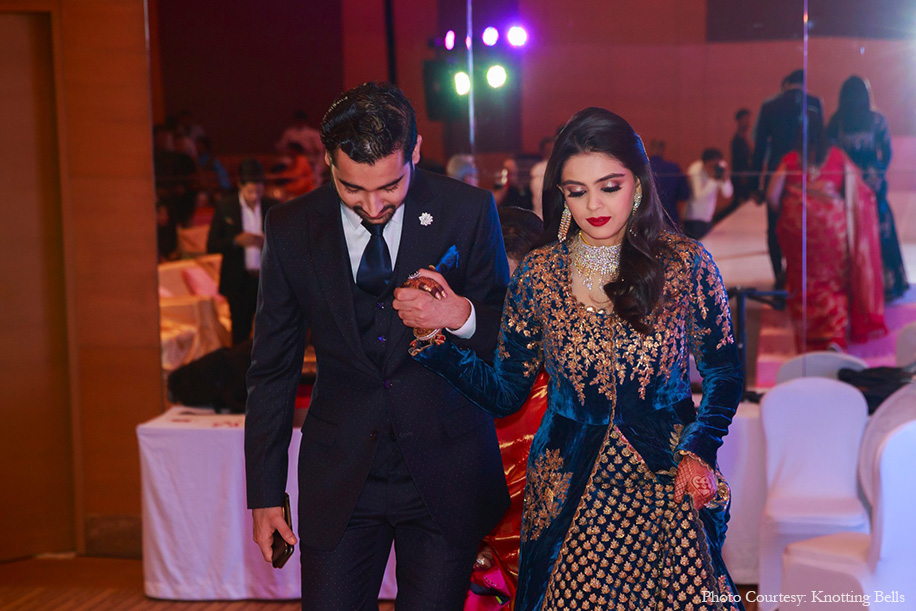 I wore a beautiful Sabyasachi creation and Amulya wore a cream sherwani as we decided to stick to a traditional color palette. For the reception, I wore a gorgeous blue creation from SVA while Amulya was on trend in a classic black suit.”