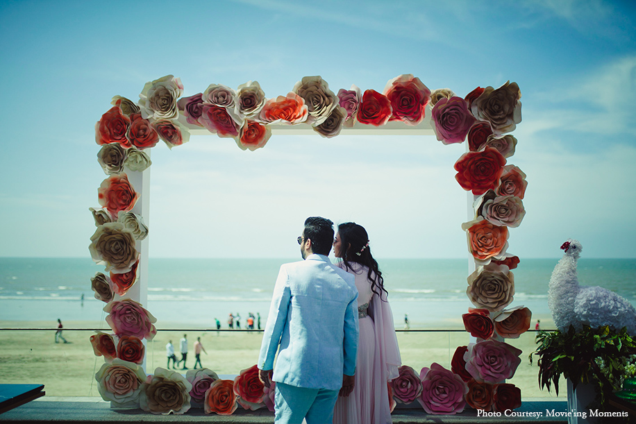 Following, the sangeet at The Westin, saw everyone in high spirits! A performance by Ameya Date entertained all the guests who loved the sea-facing venue which was decorated with colorful pinwheels, green wreaths intertwined with flowers, and a large square frame inside the venue that had a floral border comprising large pastel blooms. This frame proved to be the perfect selfie spot! Pooja looked stunning in her grey gown while Kapil exuded contemporary charm in his blue Indo-western attire!