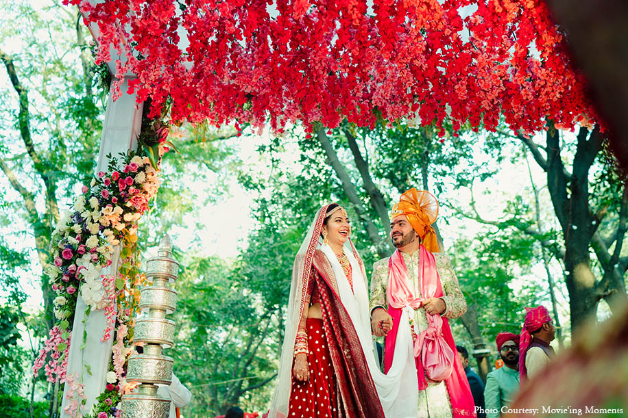 Pooja and Kapil’s pheras took place under a magnificent canopy created with profusions of red blooms. Pooja wore a pink and maroon lehenga with glittery embellishments, and Kapil donned an ivory sherwani that was resplendent with green and pink prints all over. His silk mustard color turban added a pop of color to his look, and the regal turban ornament gave him a princely vibe. He arrived for the wedding ceremony on a brightly decorated horse. Pooja got married under a floral canopy! With bright blooms forming the roof of the mandap, the entire setting looked ethereal.