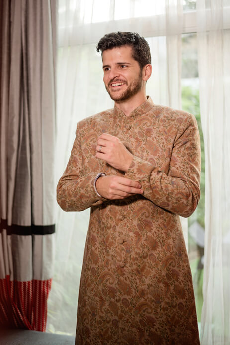 “I moved to Amsterdam from New Delhi eight years ago for my Master’s Degree and then found a job I liked as well as a man I loved. Working for the same company, our paths never crossed for three years until some common friends/colleagues invited Jasper and me to the same dinner. As they say, there’s a right time for everything; I guess it was then for us. Dating a colleague is always a different ballgame. We were both unsure if we wanted to date someone at work. We started having just coffees at work, but when you notice those coffees are happening before and after work and every day, you know you aren’t just colleagues anymore. That’s when we finally went for our first official date two months later! Soon after, he got an opportunity to work in Singapore, and I couldn’t have been the person against it. We just decided to see how it goes, and after two years of a long-distance relationship, we finally tied the knot.”
