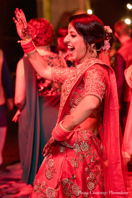 “We had an early baraat and early pheras. Jasper nailed the Indian groom look, and even my family participated in the baraat to show them how to do it right! I entered on ‘Din Shagna Da’ (there was no second choice!), and I could see my mom completely breaking down and Jasper becoming teary-eyed. After the intimate ceremony, we replicated the sangeet just with more people and different clothes. For this day, I went for the traditional red. I never wore red on someone else’s wedding, so this was my turn! I accidentally stumbled upon the beautiful red lehenga from One Pretty Girl. It was a beautiful bridal ensemble but not super heavy and just perfect for dancing after the ceremony.”