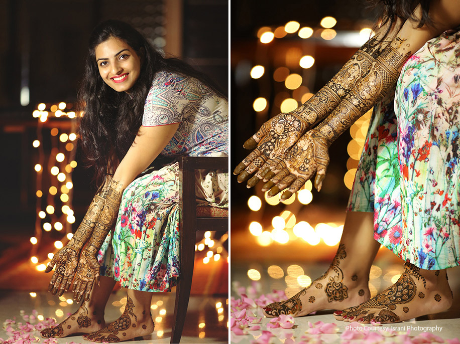 After an impromptu bridesmaids photo shoot in the hotel, the celebrations kicked off with the mehndi function. Prachi, who wanted a fresh look for this event, went with the ‘Punjabi Mela’ theme. Beautiful floral arrangements comprised the backdrop for the couple’s seating area, and the vibrant ensembles of the guests added gaiety to the function. Prachi wore an Anita Dongre creation for this fun event.