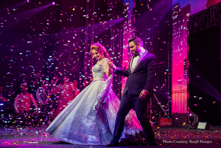 “Stepping away from the traditional line-up of events, we decided to host our cocktail party after the wedding and this turned out to be a great idea. It was the best way to end the three-day affair on a high note. DreamzKrraft lit up the venue with fresh blooms and a canopy of fairy lights. The evening was packed with energy and DJ Aman Nagpal set the mood for the night along with his troop of saxophonists, LED dhol, and lots more. We also had a few dance performances which were choreographed by Kiran J and his team. They worked very patiently with us and we totally recommend them to all the dancers with two left feet!”