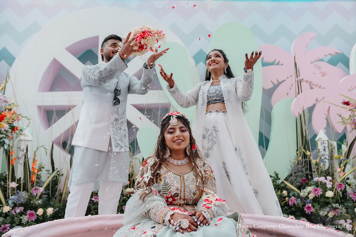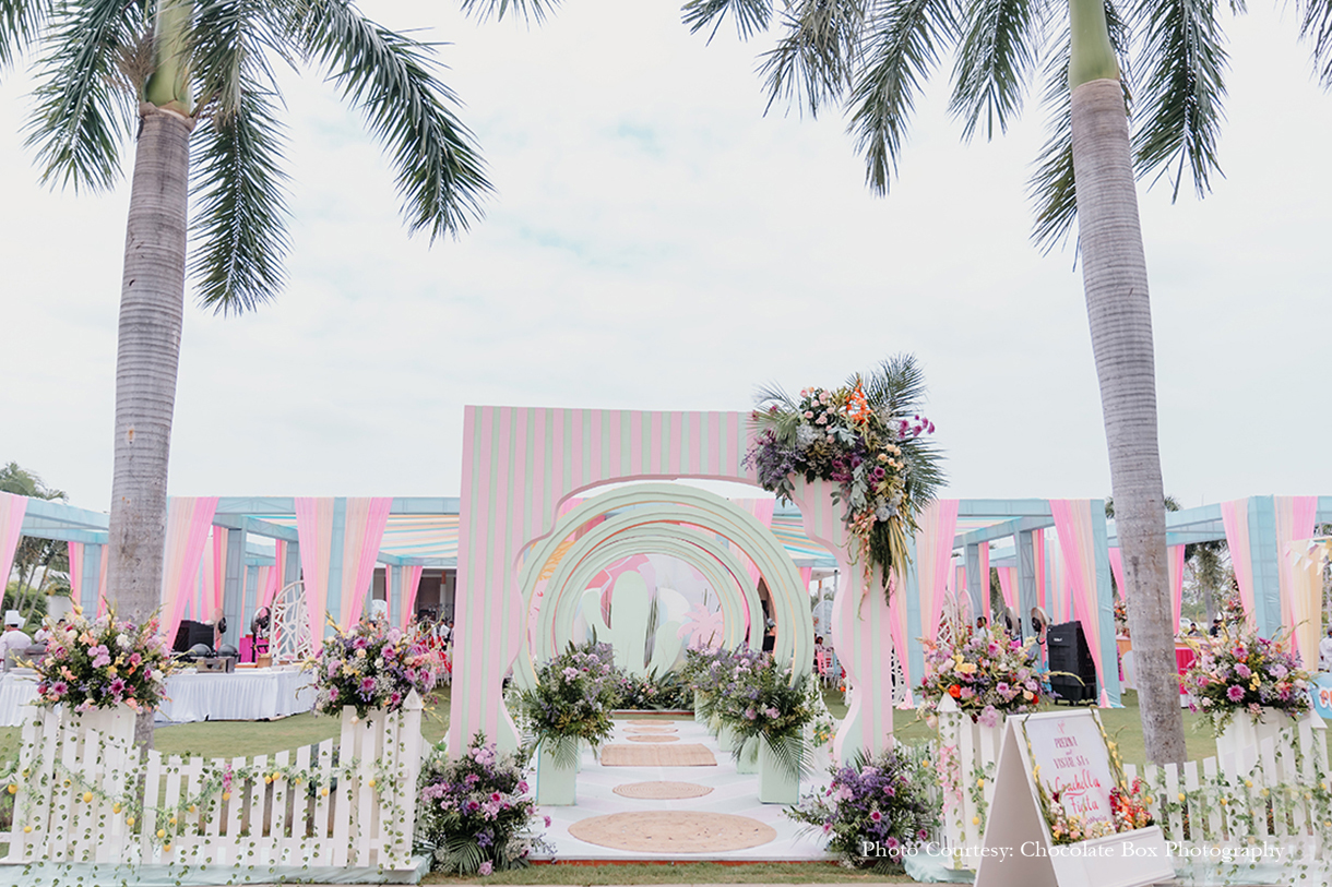 Rather than going for the usual themes that one so often sees at haldi events, the decor took a contemporary turn. Uddipta explains, “This event had a Coachella fiesta theme with colourful pastels, carnival elements, arches and bright florals to create a tropical vibe.”