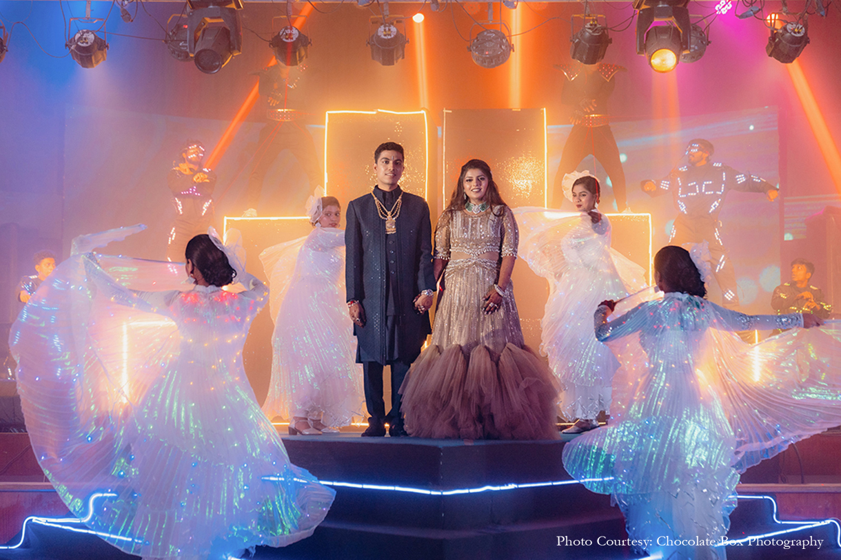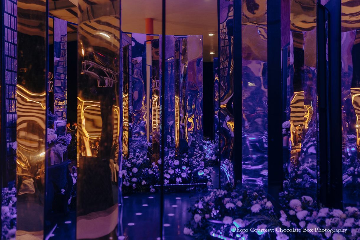 Lavender hues merged with silver to create a glamorous vibe for the sangeet. Uddipta explains, “The decor created an atmosphere filled with mirrors and dazzling crystals. The highlight was the mirror-maze installation which mesmerised the guests and gave the event a glitzy look!”