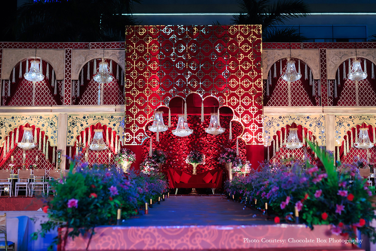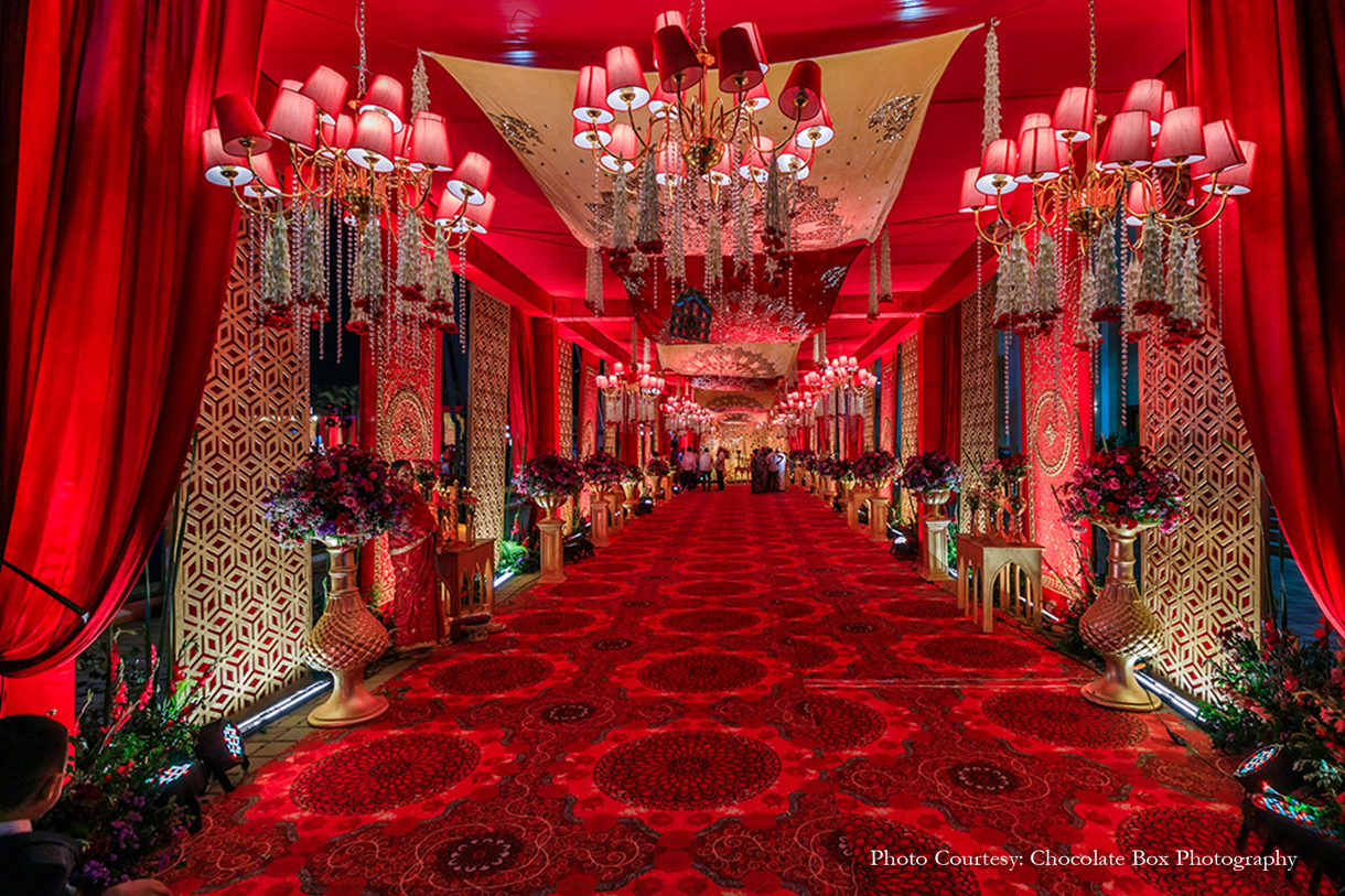 Red and gold hues dominated the colour palette for the big day. Staying close to a traditional design story, the decor consisted of gold chandeliers, walls covered with gold latticework, rattan furniture and plush red carpet.