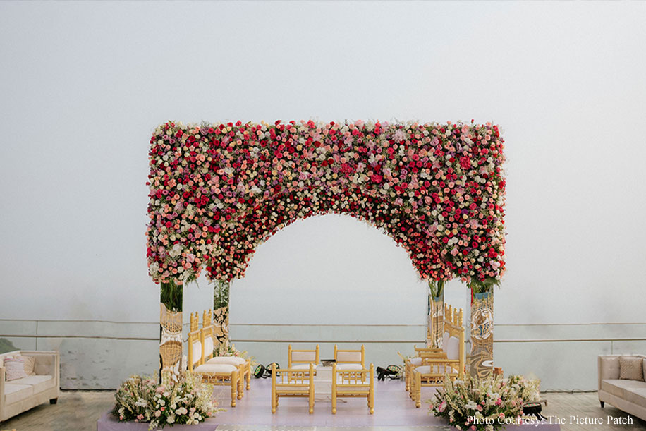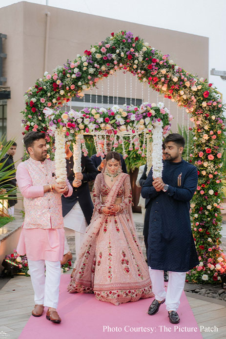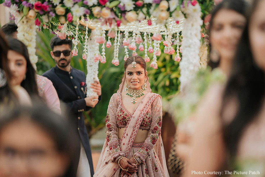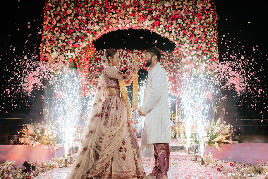 The wedding took place on a terrace with a breathtaking view of the beach, creating a stunning backdrop for the couple’s vows. The mandap of multicolored flowers was a vision to behold, and the bride’s lehenga with intricate floral detailing matched the vibe entirely. The sundowner added a warm, golden glow to the ceremony, enhancing the romantic atmosphere as the couple exchanged heartfelt promises.
