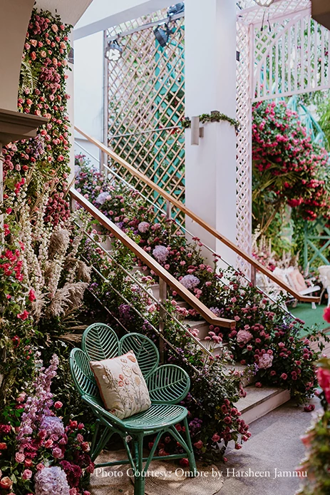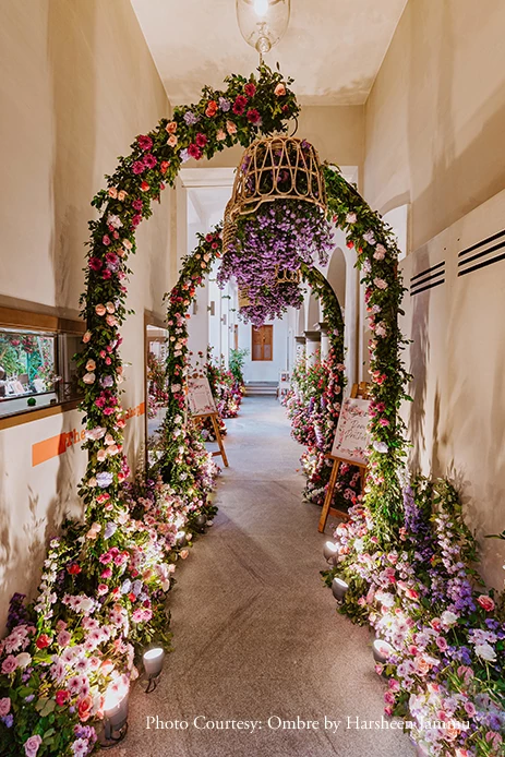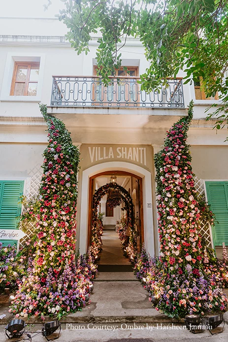 A lush installation of flowers at the entrance of Villa Shanti ushered guests into the Engagement festivities through a tunnel of flowers, with cane baskets hanging above which were full of lavender blooms. Inspired by Claude Monet’s painting of the ‘Gardens of Giverny’, the cozy space was filled with a profusion of pink blooms and greenery. A sea-green bridge formed the backdrop to the engagement ceremony, decked with the vivid fuchsia magic of blooming bougainvillea. Twinkling lights lit up the floral canopy above the guests as the evening wore on. Pouches of flowers on every seat added a sweet touch to the revelries, for people to shower petals on the couple. A lively mocktail bar added to the vibrant feel of the evening with fruit and floral cocktails.