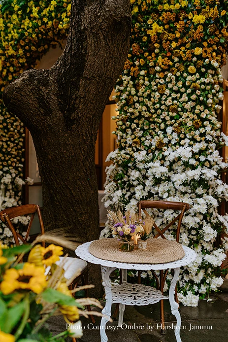 Driven by the bride’s love of Van Gogh’s Sunflower paintings, the intimate soiree at Gratitude Heritage was themed around a base palette of sunny yellow, with pops of lavender and white. A gallery of Van Gogh’s artwork with printed descriptions welcomed guests to the courtyard venue that was decked with flowers, blending with the canopy of tropical greens to create a warm, cozy ambience. Earthy sofas, wooden swings and more peppered the décor while elements of straw added a lovely barnyard feeling to the day while complementing the profusion of flowers.
