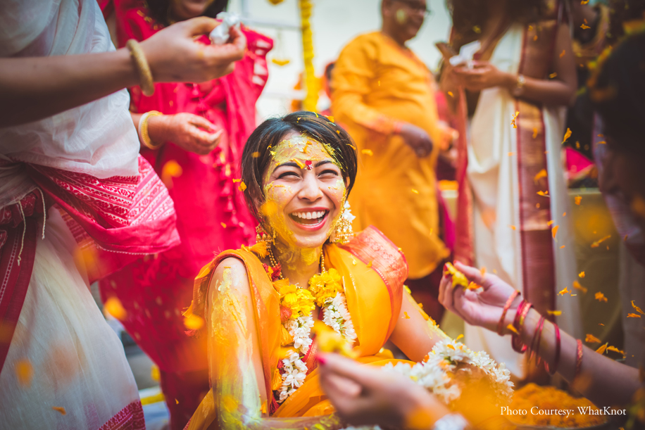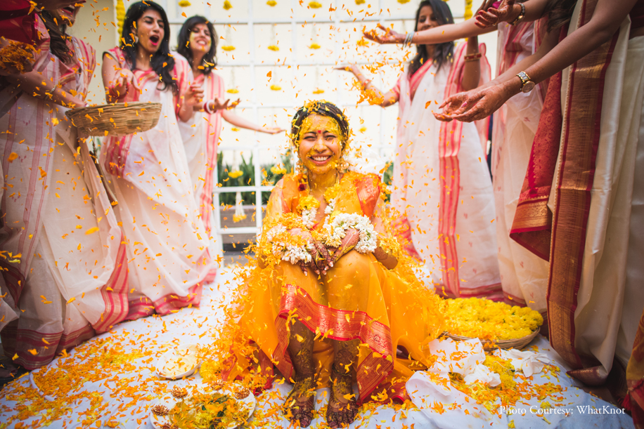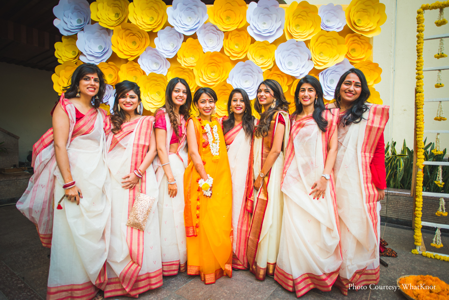 The latter part of the celebratory functions included three ceremonies, the first of which was the haldi. Besides the auspicious yellow, there were also bursts of red and white as the couple chose a Bengali theme. Guests were all dressed in shades of red and white. The bride gifted her 15 bridesmaids similar sarees for the occasion. The ceremony was hit, with a ton of dancing, laughter and, most of all, love.