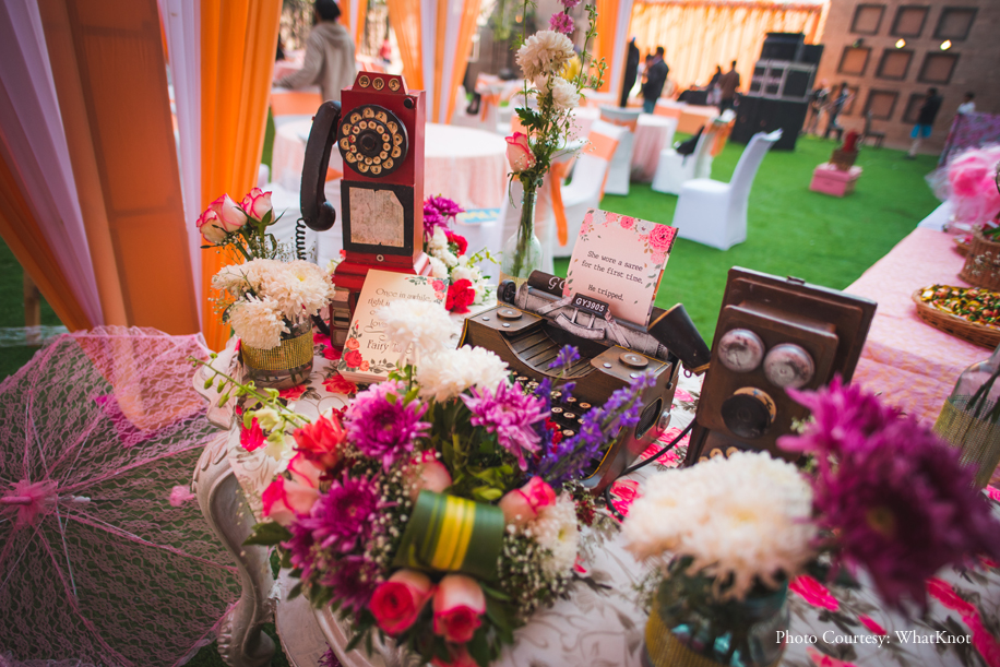 Once the haldi celebrations wrapped up, the guests gathered to enjoy a delicious brunch. The theme for this event was ‘florals and pastels’. The groom wore a pink shirt under a bandhgala with floral embroidery. The bride donned a turquoise outfit, paired with floral kaleere. The elegant décor saw floral elements and pastel fabrics softly draped around the venue. Vintage touches, such as typewriters, gramophones, and antique telephones were added for a retro feel.