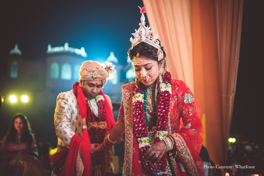 In true Bengali tradition, the bride arrived on a palanquin, covering her face with two betel leaves. Touchingly, the doli was designed and constructed by her father in his own factory. Pritika and Mudit’s varmala began as soon as the bride arrived and took place on an elevated platform with their loved ones cheering them on from the sidelines. This was followed by the traditional pheras in an emotional ceremony where Pritika and Mudit were a sight to behold.