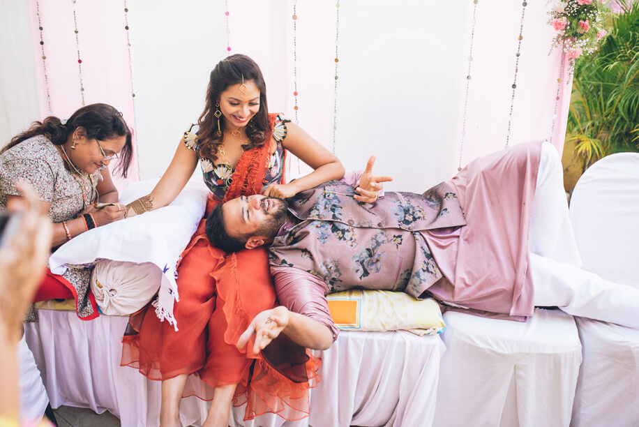 “Kartik and his family joined us for the mehndi and the decor here too was minimal. I wore a rust coloured outfit from Shivan & Narresh which was paired with a black blouse with prints and embellishments. I completed the look with an oxblood colour Sabyasachi belt and a custom designed jewellery set from The Mauve Unitx. Kartik wore a lavender silk kurta teamed with a floral jacket.”