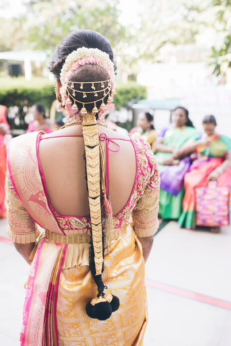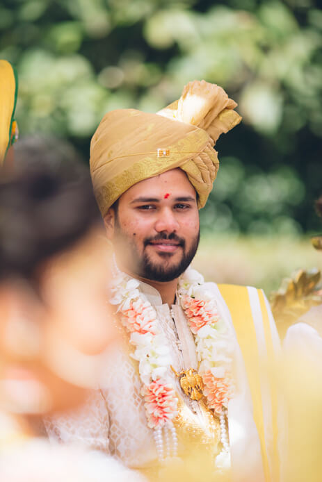 “The wedding took place just a day before my birthday. We chose the JW Marriott Hotel Bengaluru as it has a beautiful lawn with a waterfall which made for the perfect spot for the Muhurtham. The reception was hosted indoors in the ballroom. Our cocktail party was at the Le Méridien Bangalore while the mehndi and haldi ceremonies were held at home.”