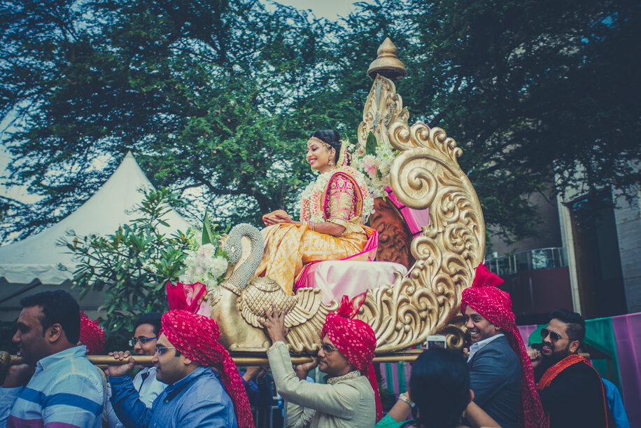 “We wanted to have a contemporary yet traditional wedding. The decor was well thought of and tastefully planned. I entered the venue in a palanquin carried by my brothers who took me to the mandap which had a criss-cross patterned roof created using pink and teal fabrics. The entire set up was accentuated with brass lotuses, bells, traditional South Indian lamps, flowers and crystals. A backdrop of shimmery paper roses along with our initials made for our photo booth backdrop.”