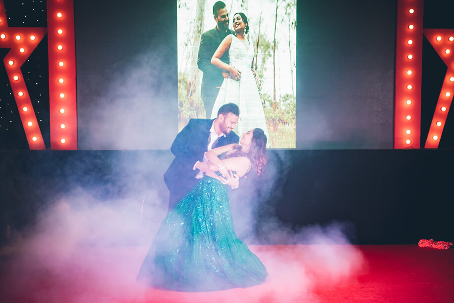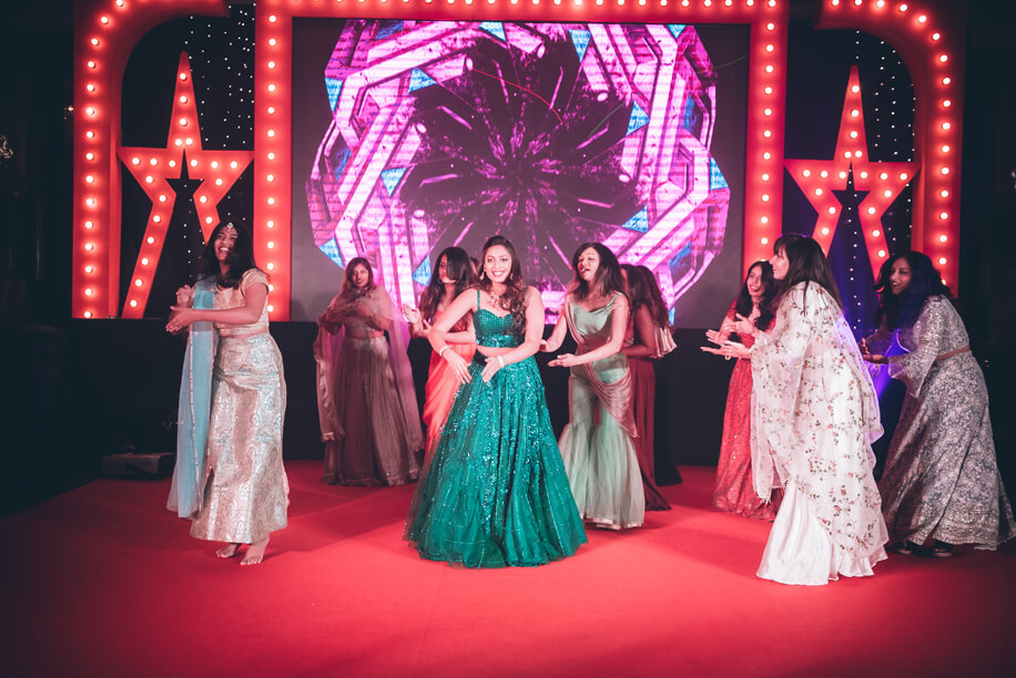 “We combined our sangeet with a cocktail party and the theme for this event was ‘A Starry Night.’ The decor made use of lots of star-shaped marquee lights and the stage featured an LED backdrop. I wore an emerald green lehenga with beadwork by Zara Umrigar and Kartik wore a deep blue velvet suit.”