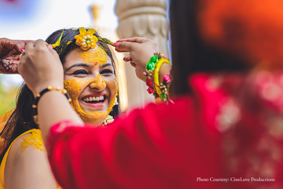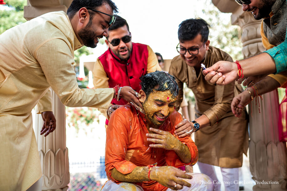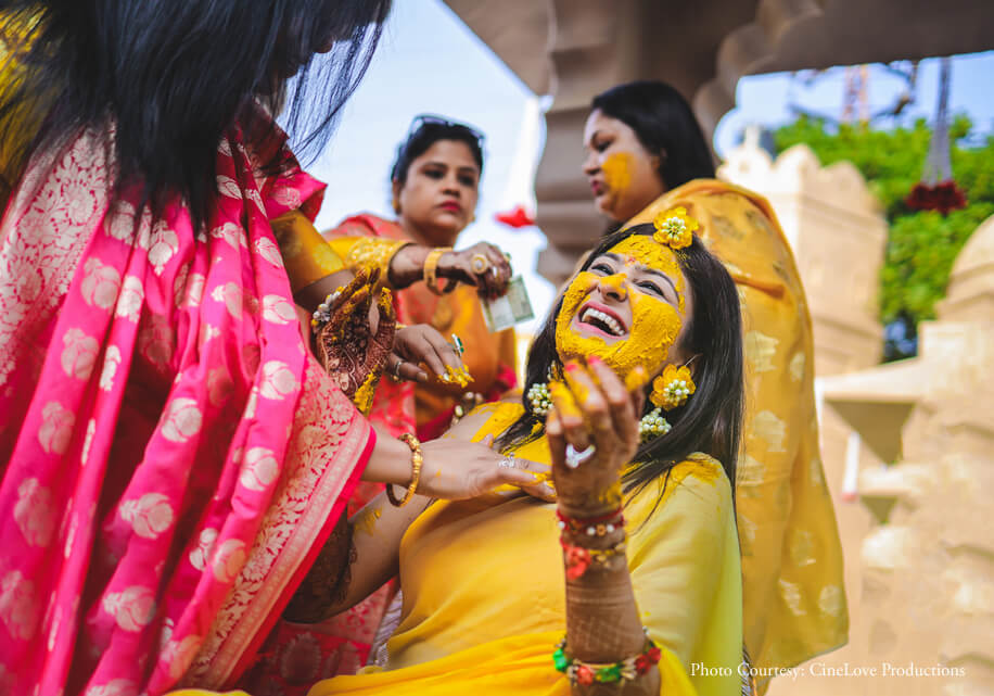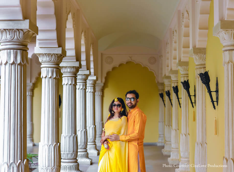 Rahul and Priyanka stuck to the traditional shades of ochre for their haldi ceremony. The bride wore a classy yellow saree with floral jewelry in similar shades, and the groom picked a classic orange kurta.