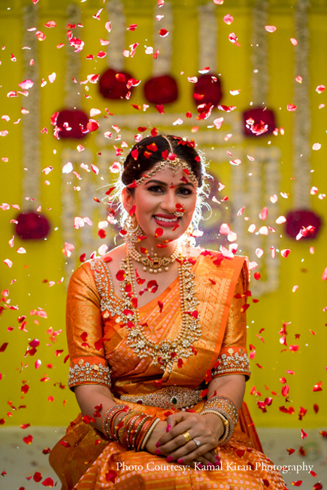“The function began with an intimate haldi ceremony followed by a larger event at a different venue. As this is a very traditional ceremony, we let the usual bright colors, such as red and yellow, dictate the aesthetics. We had a large backdrop behind the bridal seating, with lots of roses and tuberoses. Keeping with the theme of the ceremony, I opted for an orange kanjivaram saree and traditional gold jewellery.”