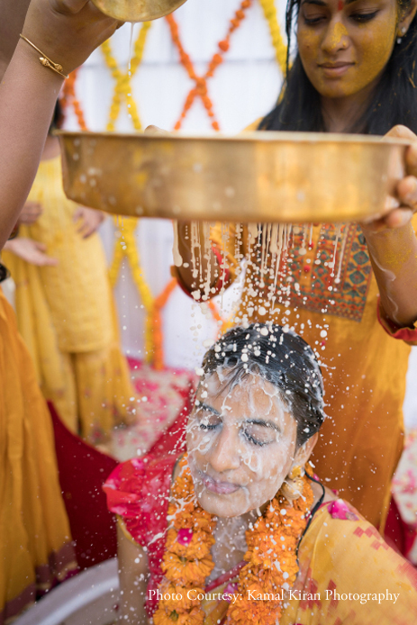 “The function began with an intimate haldi ceremony followed by a larger event at a different venue. As this is a very traditional ceremony, we let the usual bright colors, such as red and yellow, dictate the aesthetics. We had a large backdrop behind the bridal seating, with lots of roses and tuberoses. Keeping with the theme of the ceremony, I opted for an orange kanjivaram saree and traditional gold jewellery.”
