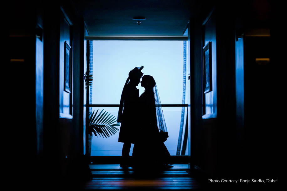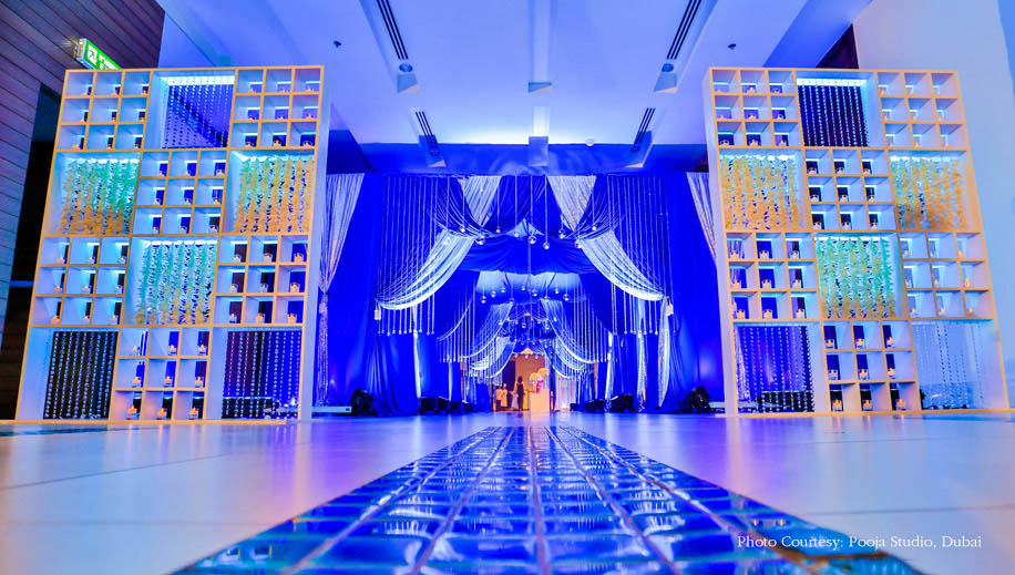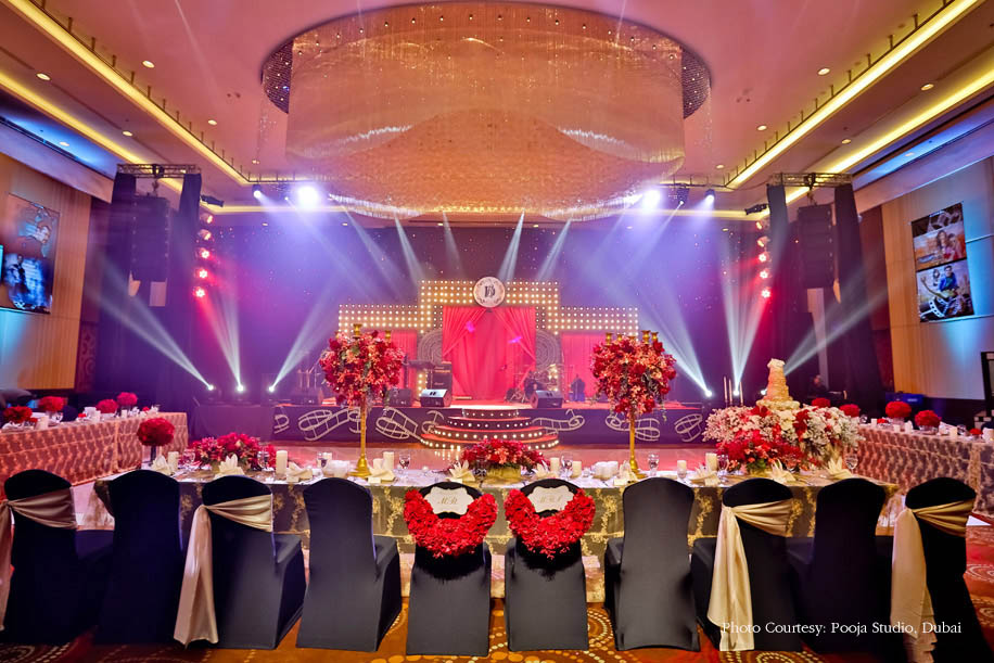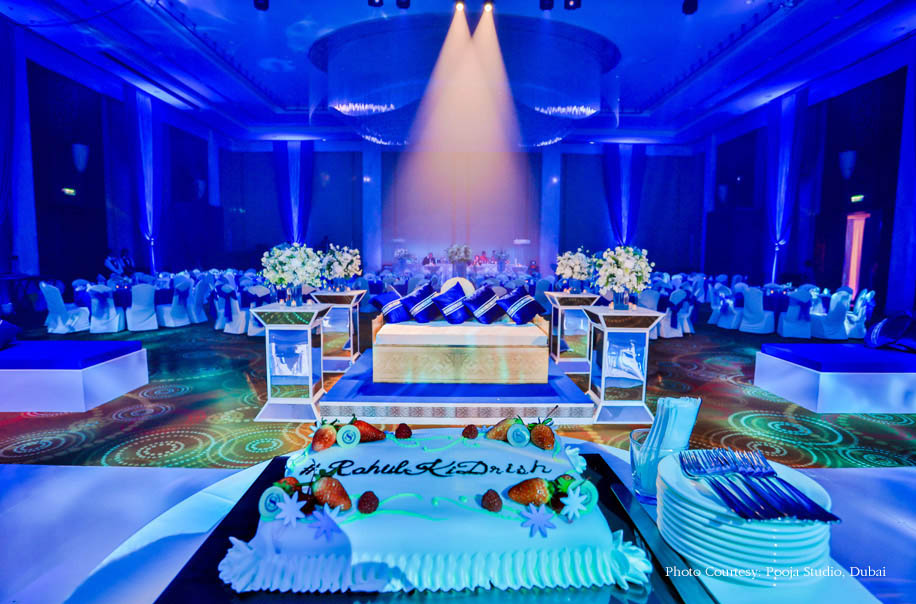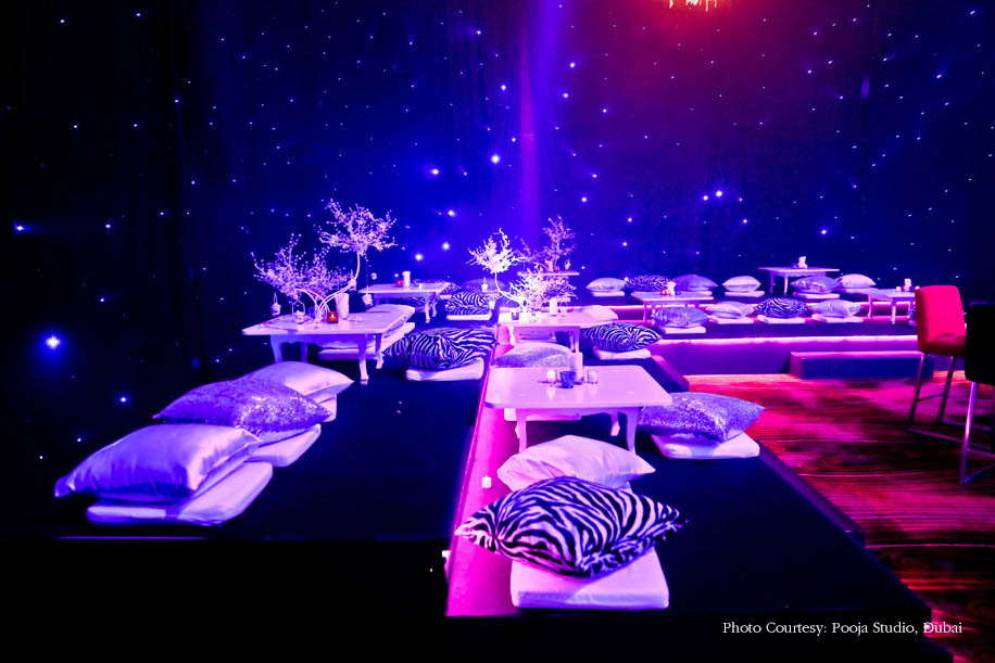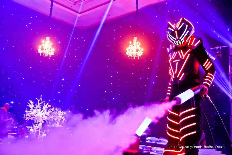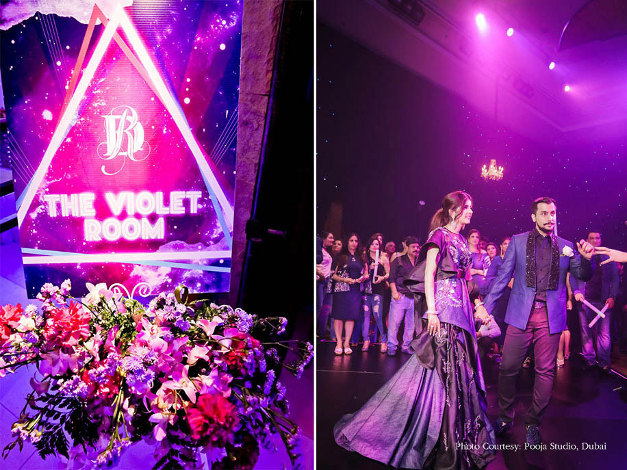 “We didn’t want the typical reception post the pheras but organized for everyone to chill out and party with us as we were officially married! The Violet Room concept was all Rahul’s idea;a dark ballroom full of neon and purple LED lights, crystal tables, black couches and grandstands on the sides. We also had a LED Robot with a Co2 gun! It was amazing. The highlight of the night was the 8-minute long groomsmen dance by Rahul and his close friends! People still talk about this night to us!”