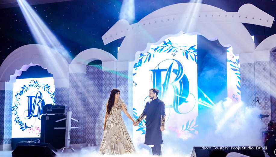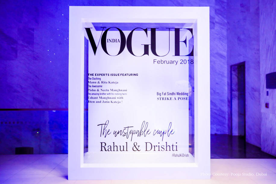 “The sangeet was all about the dances and performances. It was a sparkly, glamorous evening with décor in blue and silver. The entrance was an LED split screen and we entered to our favorite song, ‘Bandook meri laila’. Rahul got down on his knee once again for the engagement ceremony. We also had a Vogue magazine photo booth that everyone loved. I’d always dreamed of having Guru Randhawa perform at my wedding since he released ‘Suit Suit Karda’. Thanks to my parents, we were able to have him perform at the sangeet and it was amazing!”
