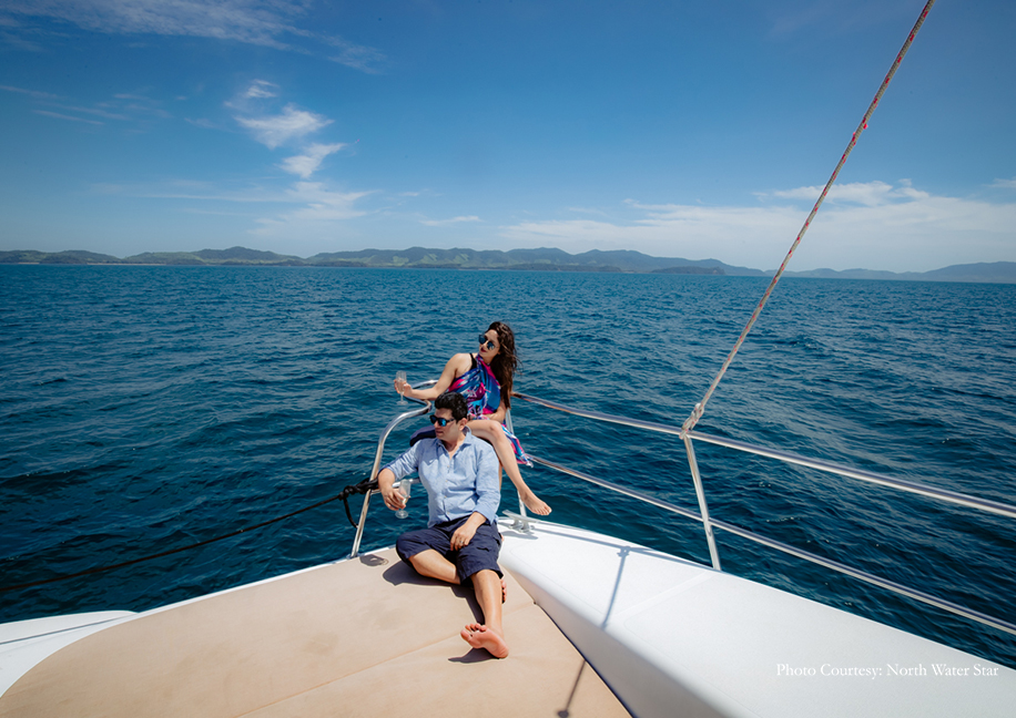 On the last day of the festivities, guests enjoyed a relaxing ride to the surrounding islands on a private Catamaran. The couple spent the day dancing, eating and unwinding with their loved ones. The groom kept it cool in a blue shirt and shorts, while the bride looked breezy in vibrant beachwear.