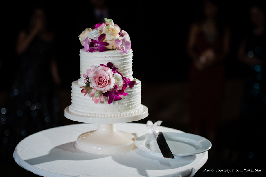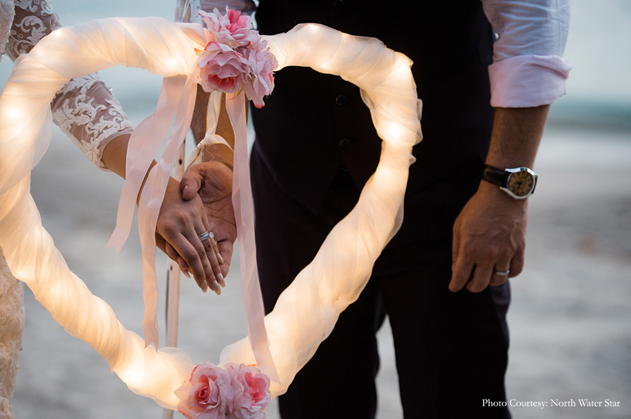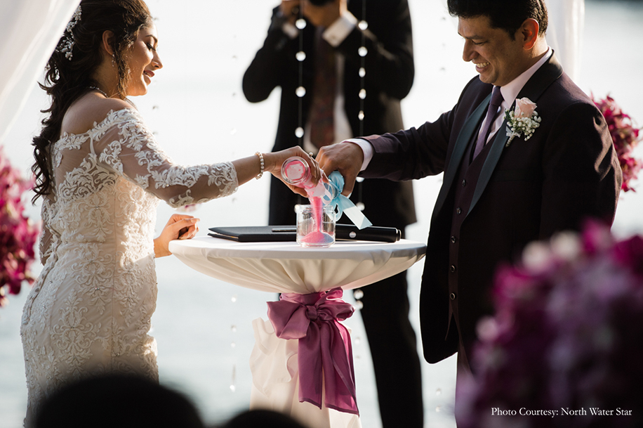 The three-day affair began with a civil ceremony held on the beach. The bride looked enchanting in a white lace gown with a romantic off-shoulder neckline, walking up to an elegant white ‘altar’ festooned with pink and purple flowers. After the vows, the groom brought everyone to tears with a toast to all the guests who came to be a part of their special day. This was followed by an incredible firework show over the ocean. To conclude the ceremony, the entire group posed with balloons which they released into the night sky. The moment was captured in a photo that was framed and gifted to each guest as a token of gratitude.”