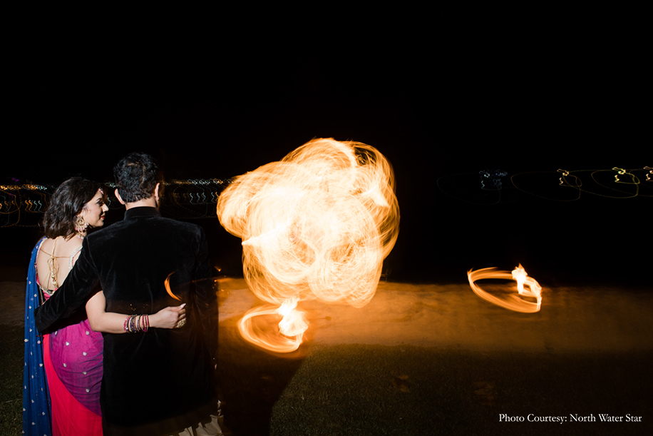 The pheras were followed by a cocktail party and sangeet ceremony. The evening began with an elegant sit-down dinner, followed by an evening of music, dance and some incredible pyrotechnics. For the function, the groom looked suave in a black sherwani from Manyavar, while the bride wore a lehenga saree in peach and blue.