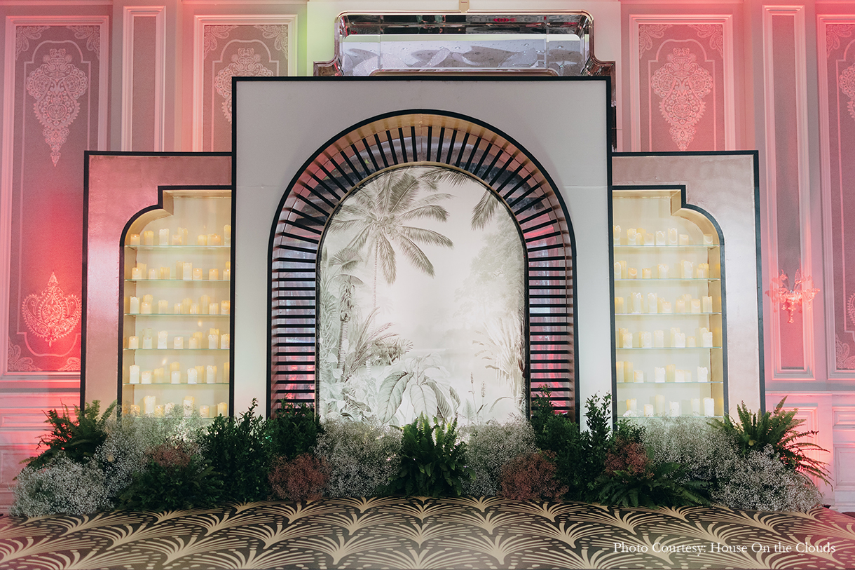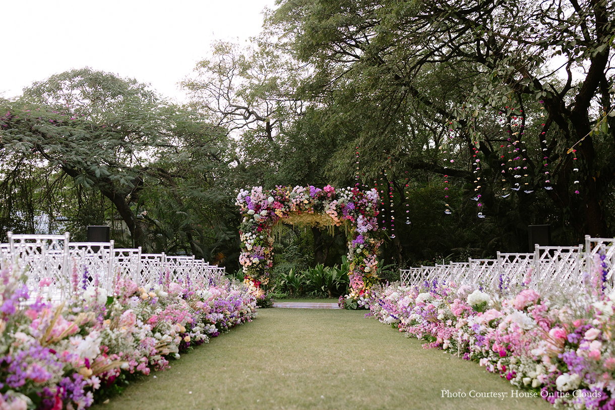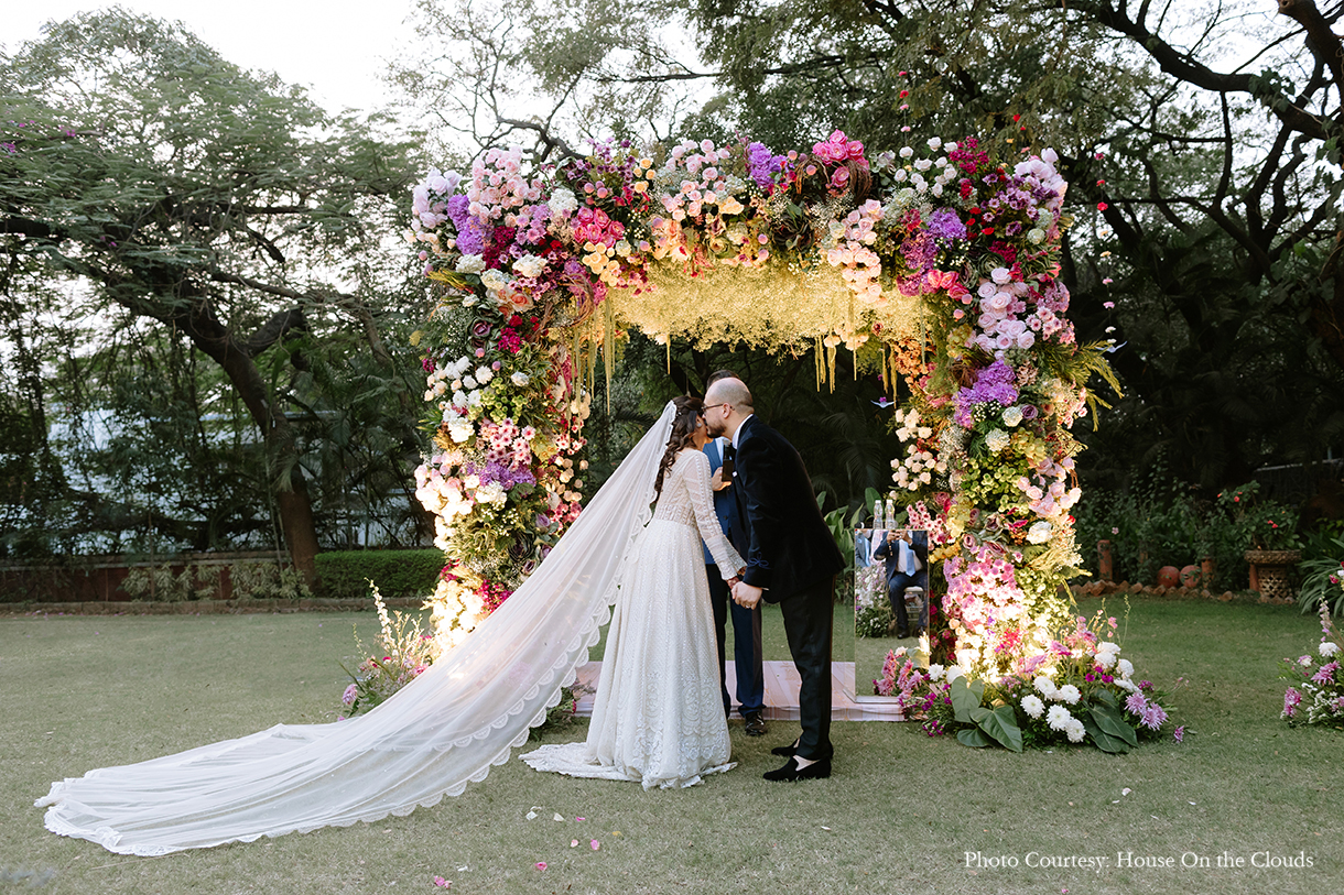 The couple followed up their Hindu wedding ceremony with Christian nuptials, hosting the function once again with a backyard celebration. The lush greenery of the lawns was lit up with blooms in every color to create an exotic paradise. A floral aisle flanked by elegant white guest seating led to the mesmerizing altar under which the couple took their vows for the second time.
