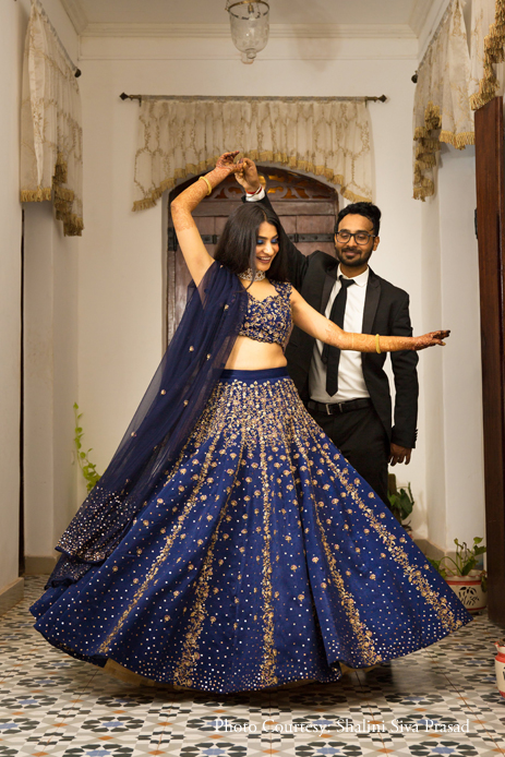 The bride lit up the sangeet evening in a sparkling bespoke blue lehenga from Riantas’s in Delhi as she twirled with the love of her life. Pushkar looked suave in a black tuxedo from Emporio Armani. For the evening of dance and music, the decor was centered around a play of lights that lent a magical feel to the celebrations.