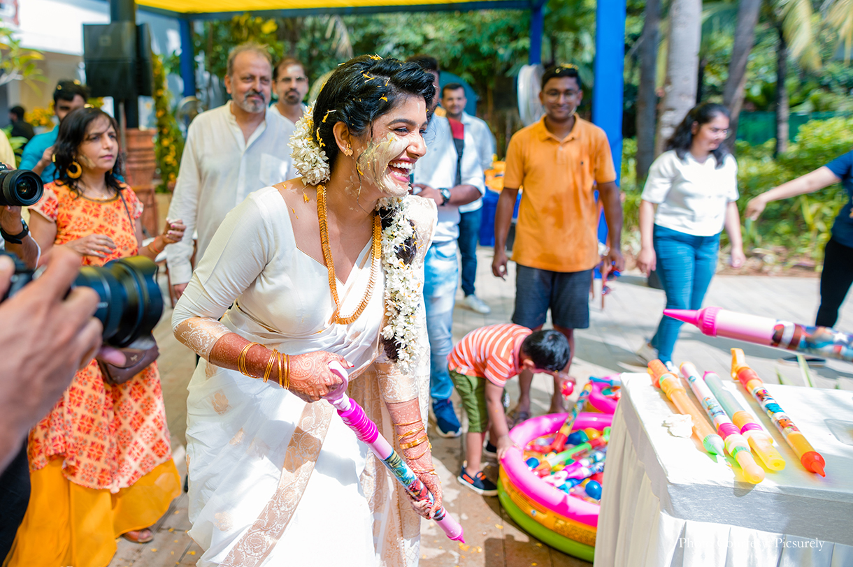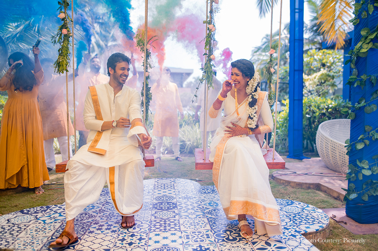 The next morning began with sunkissed festivities of the Haldi ceremony, filled with tender moments of love, family, and tradition. The poolside soiree was decked with a refreshing decor palette of yellow and blue, full of breezy drapes, gorgeous florals, and more. Dressed in white, the couple looked pristine as they sat on flower-decorated swings for the ceremony.
