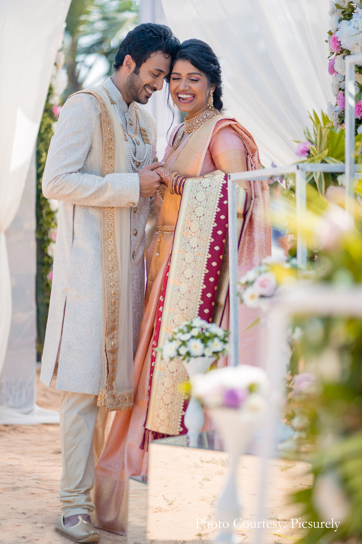 Hosted by the beach with the enchanting sounds and shimmering waters of the sea as the backdrop, the wedding ceremony was straight out of a dream. A simple yet stunning palette of white set the tone for everything from the aisle, mandap, and drapes, elevated with romantic floral arrangements in fresh spring hues. The couple matched the setup with delicate hues of cream and peach as they took their vows.