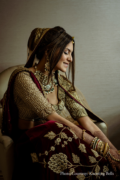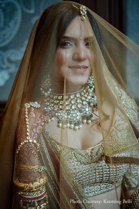 The bride’s rich Jadau pearl jewelry looks enchanting, veiled softly beneath her golden dupatta.