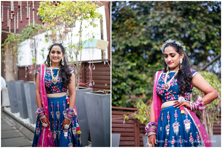 “The theme for the mehndi was a carnival, and I wore a blue lehenga from Summer by Priyanka which I paired with floral jewellery. We hosted this function at the Malabar Hill Club, and the decor made use of lots of white flowers ‘ladis’ (strands) and roses. There were hanging elements at the entrance, and inside the banquet area, there was a canopy created using strings of flowers. We also incorporated fairy lights into the mix to add a hint of sparkle. This was the first Indian function that many of our American and Chinese friends had attended. All of them were so excited and made it a point to dress in Indian clothes. Although we insisted that it was alright if they came in jeans, they went shopping in the morning and returned in their Indian avatars! Since they were attending an Indian wedding for the first time, they didn’t know what to expect. The guys were confused if they too were supposed to get henna applied. They were like little children – confused but very enthusiastic! And it was very heart-warming to see them feeling so involved.”