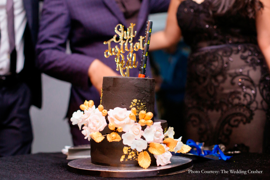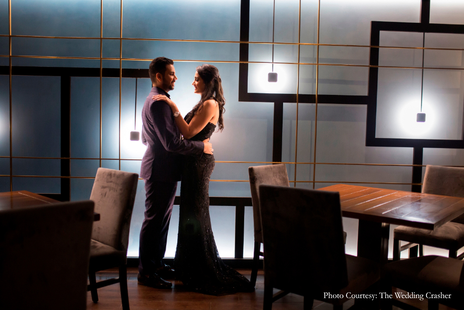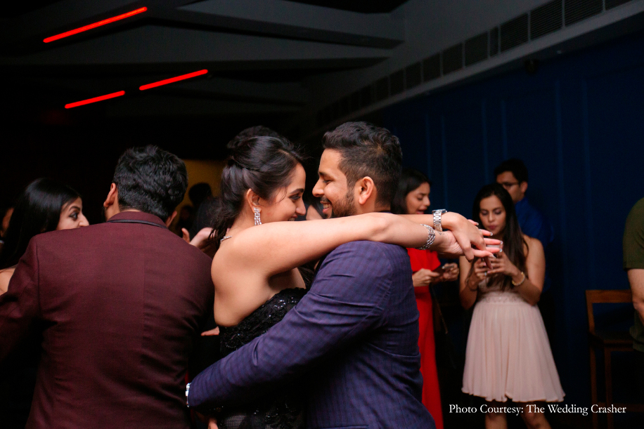 “Our cocktail party was initially going to be a brunch. However, I picked out a black gown for myself from Dubai and knew that I wanted to wear that at one of my functions. Since black wasn’t an appropriate color for brunch, we changed plans and decided to host a night-time affair. To add to it, just a few weeks before the event, we were forced to change our venue and look for different options! The location for the function, which was Amadeus, was finalized only two weeks before the event and there was a lot of madness that surrounded this function, but once it all settled it looked like it was all destiny’s plan! This was the same restaurant we had gone to on our first date, and it only made sense to host our first wedding function here. It made the affair a lot more special. We did not have any decor expected for a few Instagram board cutouts that my friend, who runs Craft on Designs, made for us.”