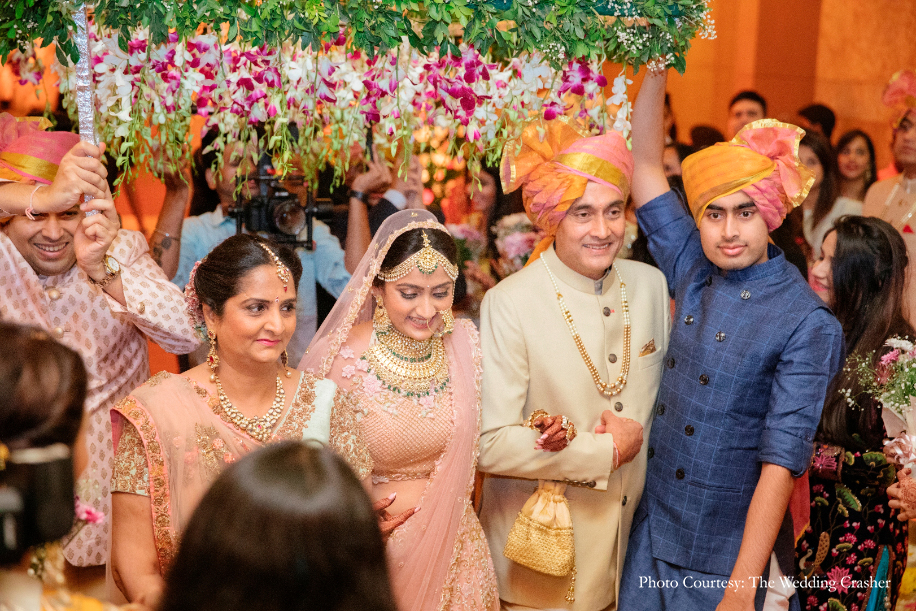 “Our wedding was held at Grand Hyatt Mumbai. I left home at 6:30 in the morning for the mahurat hour, and got ready for the wedding later at the hotel itself. When I started getting ready, I realized that we had forgotten both my dupattas at home. To make matters worse, the key to my cupboard was with us at the hotel. My father who was at home at the time broke the cupboard open by pulling the door out! In retrospect, I think it was rather funny, but during that time, we flipped out! Dhairya, on the other hand, had major cold feet on the wedding day. He had such a massive panic attack that he thought he was going to faint. So he decided to nap and slept until all his family and friends arrived fully dressed up. At one point everyone had already started dancing while he was still asleep because he was stressing out! Despite it all, we did eventually get married! Our pheras were conducted as per the Jain rituals. I wore a Love Story Lehenga from Koecsh by Kresha Bajaj. For the decor, we made use of a lot of pink and white florals, and the results were just dreamy.”