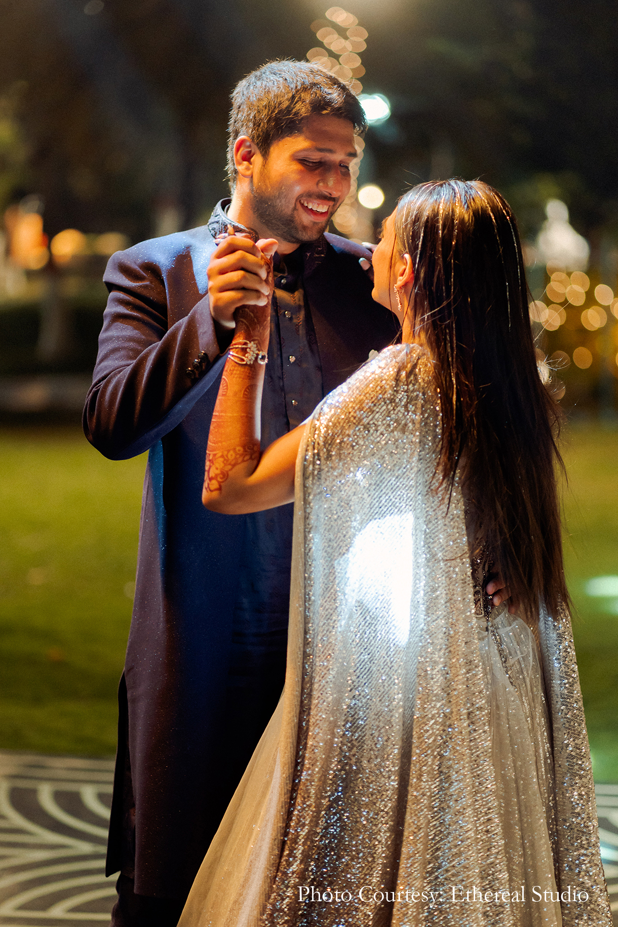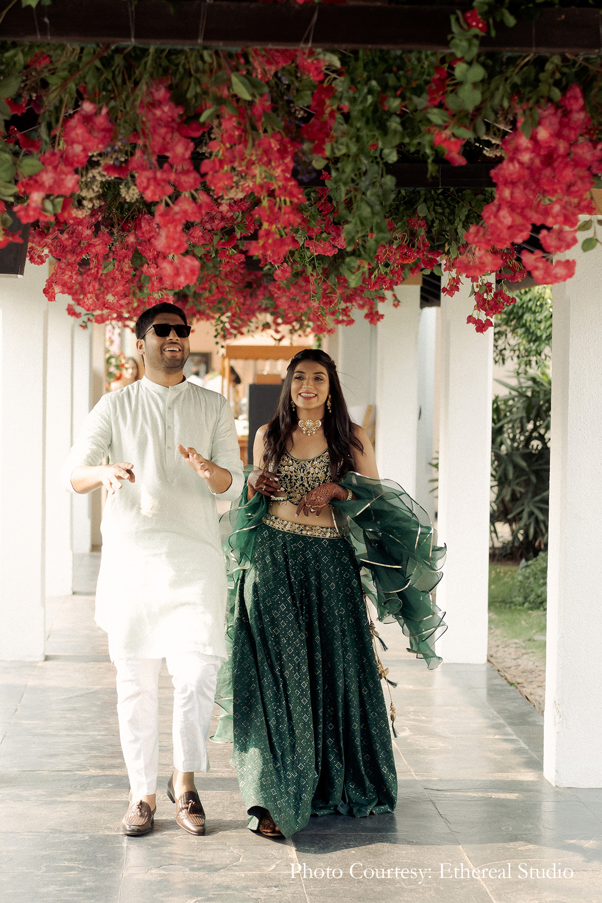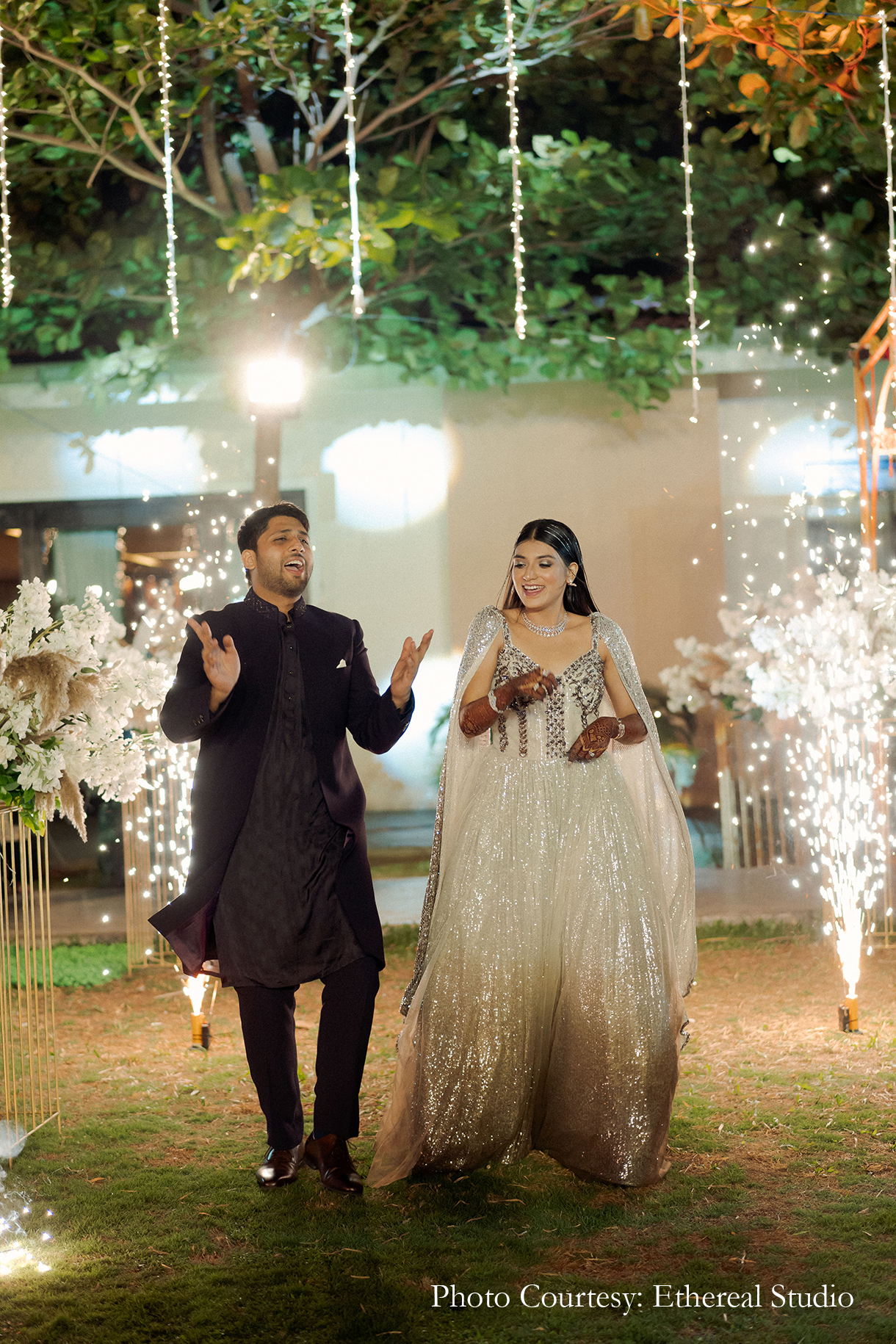 After the laid back vibes of the mehndi, the couple amped up the glamor quotient with a glitzy sangeet! Entering the event with a scene reminiscent of the popular TV series ‘The Office’, the couple had their friends mesmerized. Flashing lights and graceful performances set the mood to party.