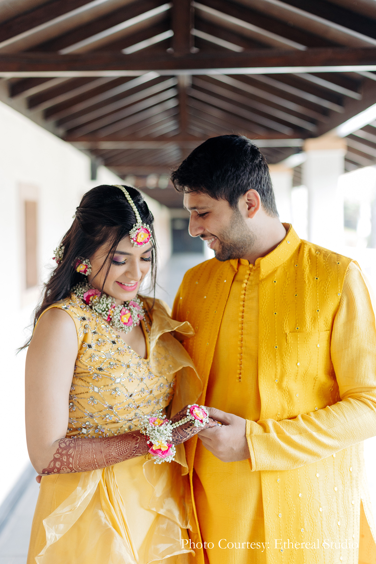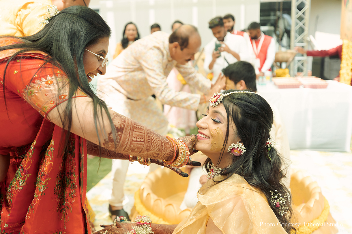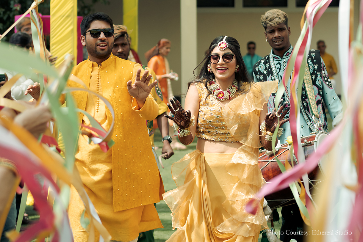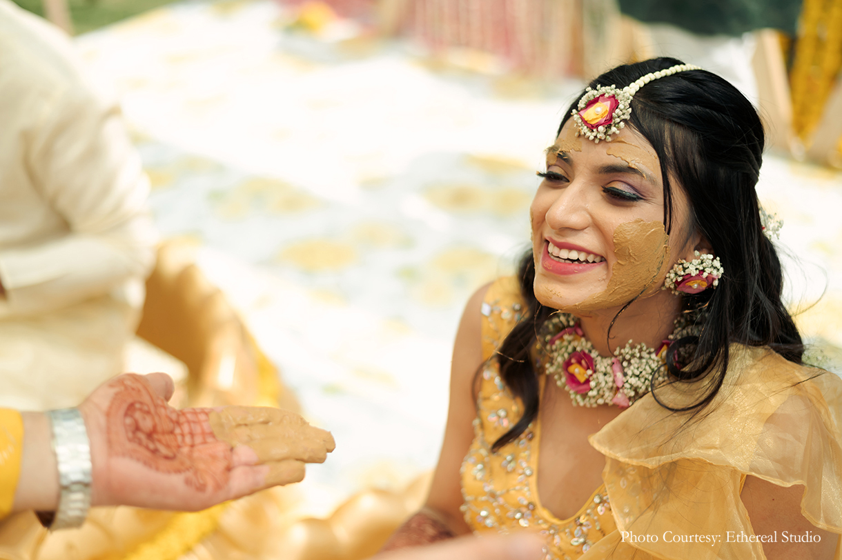 Taking the ‘pop of colours’ theme, the haldi didn’t follow the conventional ‘all-yellow’ decor route. Instead, the pops of yellow were complemented by dashes of pink and white. With the couple being welcomed by their friends holding up ribbon wands, the haldi was a playful affair as the to-be-weds seated on brass urlis were slathered with a mixture of turmeric by their loved ones.