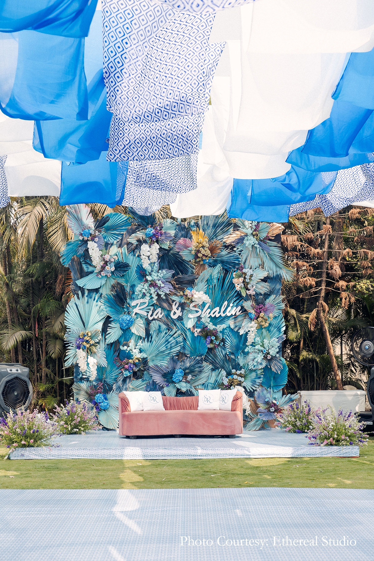 With a Mykonos theme decor, the mehendi and pool party had everyone kicking back and relaxing under the sun. Decorated with white and blue hues that reflected the breezy vibes of Greece. A blue-hued backdrop with tropical foliage flanked the couple as they sat on a comfy rose pink sofa and enjoyed the festivities.