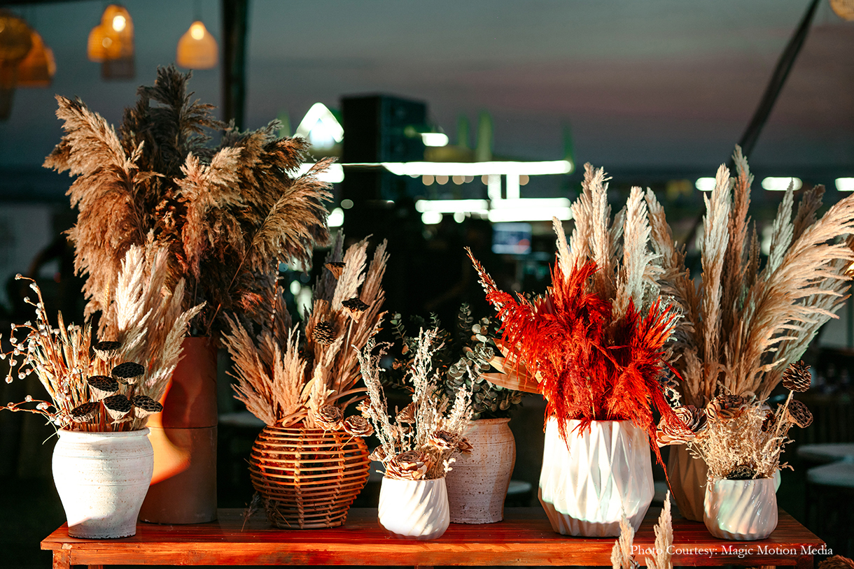 The festivities kicked off with a laid-back yet vibrant, boho-chic Welcome Dinner. As the sun dipped below the horizon, guests arrived at an atmosphere filled with warm hellos, laughter, and fun food stations. The evening was elevated with cocktails, mesmerizing live music by BORS Band Goa. The highlight of the night? A breathtaking fire act duo, setting the stage for an unforgettable celebration ahead.
