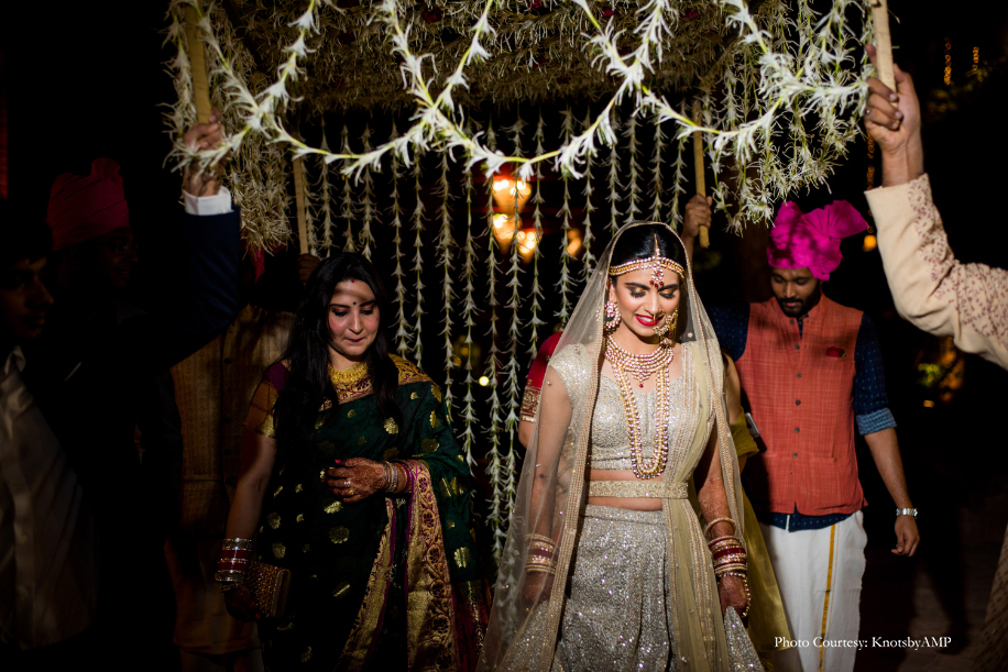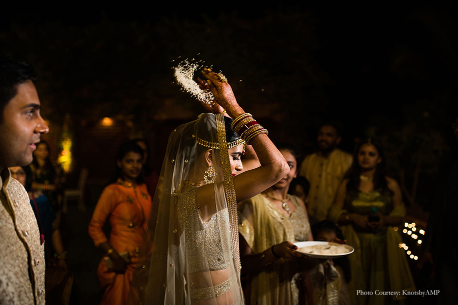 Bride’s Outfits: Malasa (Cocktail Dinner Party), Shraddha Ponnappa (Haldi) Dabka Dori (Wedding)
